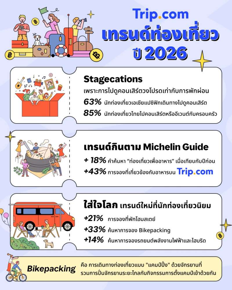• ”Stagecations” กำลังได้รับความนิยมในกลุ่มครอบครัว: Stagecation หรือการการท่องเที่ยวเพื่อชมความบันเทิงสดกำลังได้รับความนิยมเพิ่มขึ้น ปัจจุบันนักเดินทางในภูมิภาคเอเชียแปซิฟิกกว่า 63% เดินทางเพื่อชมคอนเสิร์ตหรือ่วมงานอีเวนต์ ขณะที่นักท่องเที่ยวชาวไทยถึง 85% มักผสมผสานทริปคอนเสิร์ตหรือเทศกาลเข้ากับการท่องเที่ยวพักผ่อนของครอบครัว โดยมีเมืองศูนย์กลางยอดนิยมอย่างมาเก๊า ลาสเวกัส เมลเบิร์น และสิงคโปร์เป็นจุดหมายหลัก