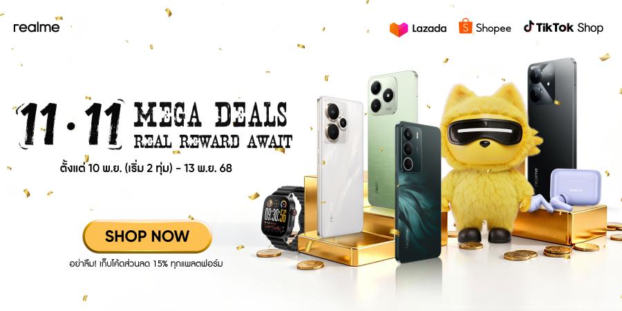 แคมเปญ “11.11 Mega Deals Real Reward Await” จัดเต็มระหว่างวันที่ 10 – 13 พฤศจิกายน แฟน ๆ สามารถกดเก็บโค้ดส่วนลดได้บนทุกแพลตฟอร์มออนไลน์ของ realme ก่อนเลือกช้อปสมาร์ตโฟนและแกดเจ็ตดีไซน์ล้ำในราคาสุดพิเศษ ไม่ว่าจะเป็นสมาร์ตโฟนรุ่นยอดนิยม realme 15 Series สายแรงสเปกโหดจาก realme GT Series หรืออุปกรณ์เสริมสุดฮิตอีกหลากหลาย ที่พร้อมอัปเกรดไลฟ์สไตล์ให้สนุกและมีประสิทธิภาพยิ่งขึ้นในทุกวัน