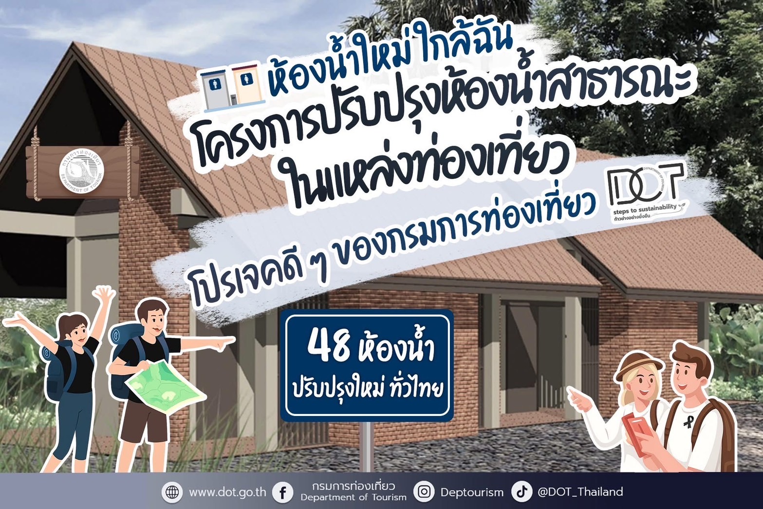 กรมการท่องเที่ยว จึงได้ดำเนินโครงการปรับปรุงห้องน้ำสาธารณะในแหล่งท่องเที่ยว โดยมีเป้าหมายเพื่อปรับปรุงห้องน้ำให้มีคุณภาพและได้มาตรฐานทั่วประเทศ ซึ่งขณะนี้มีห้องน้ำสาธารณะในแหล่งท่องเที่ยวที่ปรับปรุงแล้วเสร็จ พร้อมให้บริการนักท่องเที่ยว จำนวน 12 แห่ง ได้แก่ ศูนย์บริการนักท่องเที่ยวน้ำตกนางครวญ อุทยานแห่งชาติลำคลองงู เนินกูดดอย อุทยานแห่งชาติทองผาภูมิ จังหวัดกาญจนบุรี ที่ทำการอุทยานแห่งชาติน้ำพอง (ลานนับดาว) จุดชมวิวหินช้างสี วัดธาตุ พระอารามหลวง พระธาตุขามแก่น วัดพระบาทภูพานคำ จังหวัดขอนแก่น วัดภูมินทร์ วัดศรีพันต้น จังหวัดน่าน วัดราชบูรณะ จังหวัดพิษณุโลก ปราสาทหินพนมวัน จังหวัดนครราชสีมา และวัดเขาช่องพราน จังหวัดราชบุรี และอยู่ระหว่างดำเนินการในพื้นที่อื่นๆ ให้ครบทั่วประเทศภายในปี 2569”