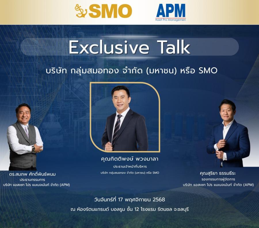 งาน Exclusive Talk ของ บริษัท กลุ่มสมอทอง จำกัด (มหาชน) หรือ SMO ในวันที่ 17พฤศจิกายนนี้ ณ Grand Ballroom ชั้น 12โรงแรมรัตนชล ชลบุรี เป็นโอกาสที่ดีสำหรับผู้ที่สนใจอุตสาหกรรมปาล์มและธุรกิจพลังงานชีวภาพ ในการรับฟังข้อมูลทิศทางธุรกิจจากผู้บริหารอย่างใกล้ชิด จาก กิตติพงษ์ พวงมาลาCEO ที่จะมาตอกย้ำวิสัยทัศน์การเติบโตขององค์กร พร้อมรับฟังมุมมองเพิ่มเติมจากผู้บริหาร APM ได้แก่ ดร.สมภพ ศักดิ์พันธ์พนมและ คุณสุริยา ธรรมธีระ ที่จะเสริมภาพรวมด้านกลยุทธ์ ผู้เข้าร่วมจะได้รับข้อมูลที่ช่วยให้เห็นภาพอนาคตของ SMO ได้อย่างชัดเจนยิ่งขึ้นรวมถึงแนวคิดและแผนงานที่สะท้อนความมุ่งมั่นของบริษัทในการก้าวสู่การเติบโตอย่างยั่งยืน สำหรับผู้ที่ติดตามเส้นทางของ SMO งานนี้เป็นอีกหนึ่งโอกาสสำคัญในการทำความเข้าใจวิสัยทัศน์ขององค์กรอย่างใกล้ชิดค่ะ