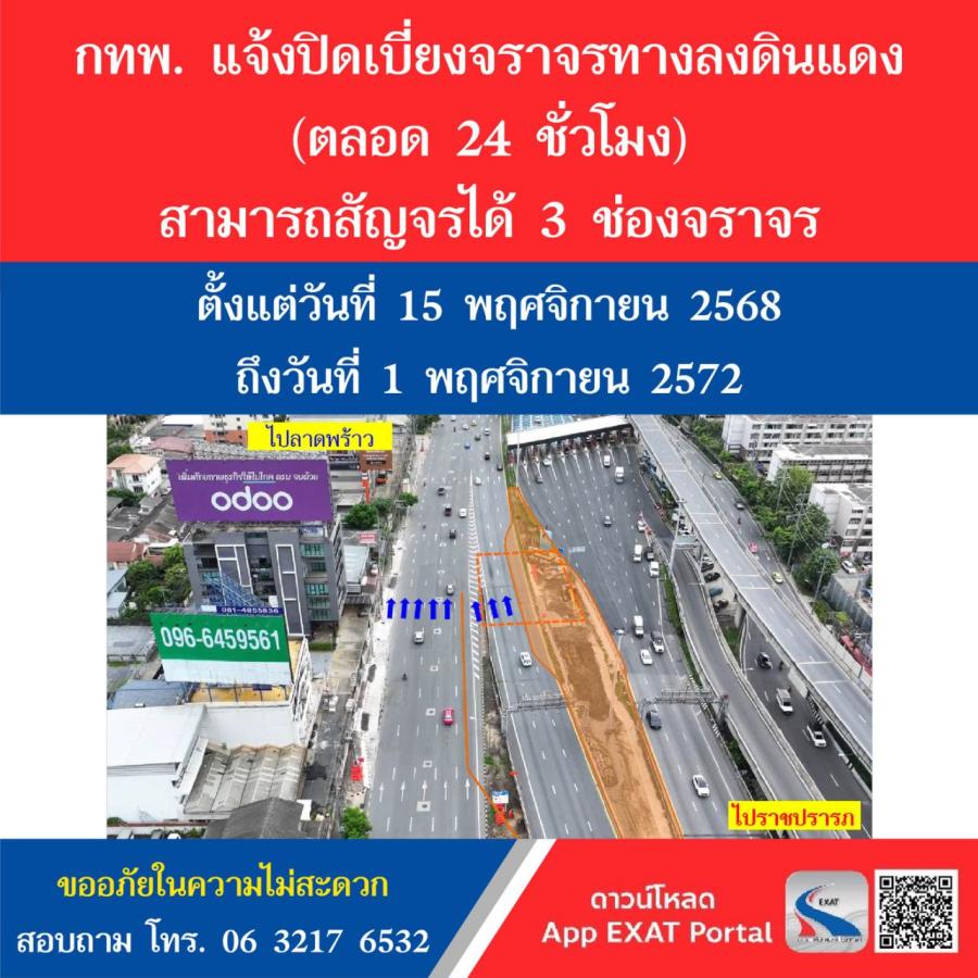การทางพิเศษแห่งประเทศไทย (กทพ.) กระทรวงคมนาคม แจ้งการปิดเบี่ยงการจราจรทางลงดินแดง ทางพิเศษเฉลิมมหานคร ตลอด24 ชั่วโมง เนื่องด้วยการรถไฟฟ้าขนส่งมวลชนแห่งประเทศไทย (รฟม.) ได้ว่าจ้าง บริษัท ช.การช่าง จำกัด (มหาชน) เป็นผู้รับจ้างดำเนินการก่อสร้างโครงการรถไฟฟ้าสายสีส้ม ช่วงบางขุนนนท์- มีนบุรี (สุวินทวงศ์) จะดำเนินการก่อสร้างปล่องระบายอากาศที่ 6(IVS06) บริเวณทางลงดินแดง ทางพิเศษ เฉลิมมหานคร จึงมีความจำเป็นต้องปิดเบี่ยงจราจรบริเวณทางลงดินแดง มุ่งหน้าถนนวิภาวดีรังสิต ตั้งแต่วันที่ 15 พฤศจิกายน 2568 ถึงวันที่ 1 พฤศจิกายน 2572 ตลอด 24 ชั่วโมง โดยสามารถสัญจรได้ 3 ช่องจราจร ทั้งนี้ บริษัท ช.การช่าง จำกัด (มหาชน) ได้ติดตั้งป้ายเตือนก่อนถึงพื้นที่ดำเนินการ และติดตั้งป้ายเตือน สัญญาณต่าง ๆ ป้ายประชาสัมพันธ์การเบี่ยงการจราจรเพื่อให้สัญญาณแก่ผู้ใช้ทางพิเศษทราบ
