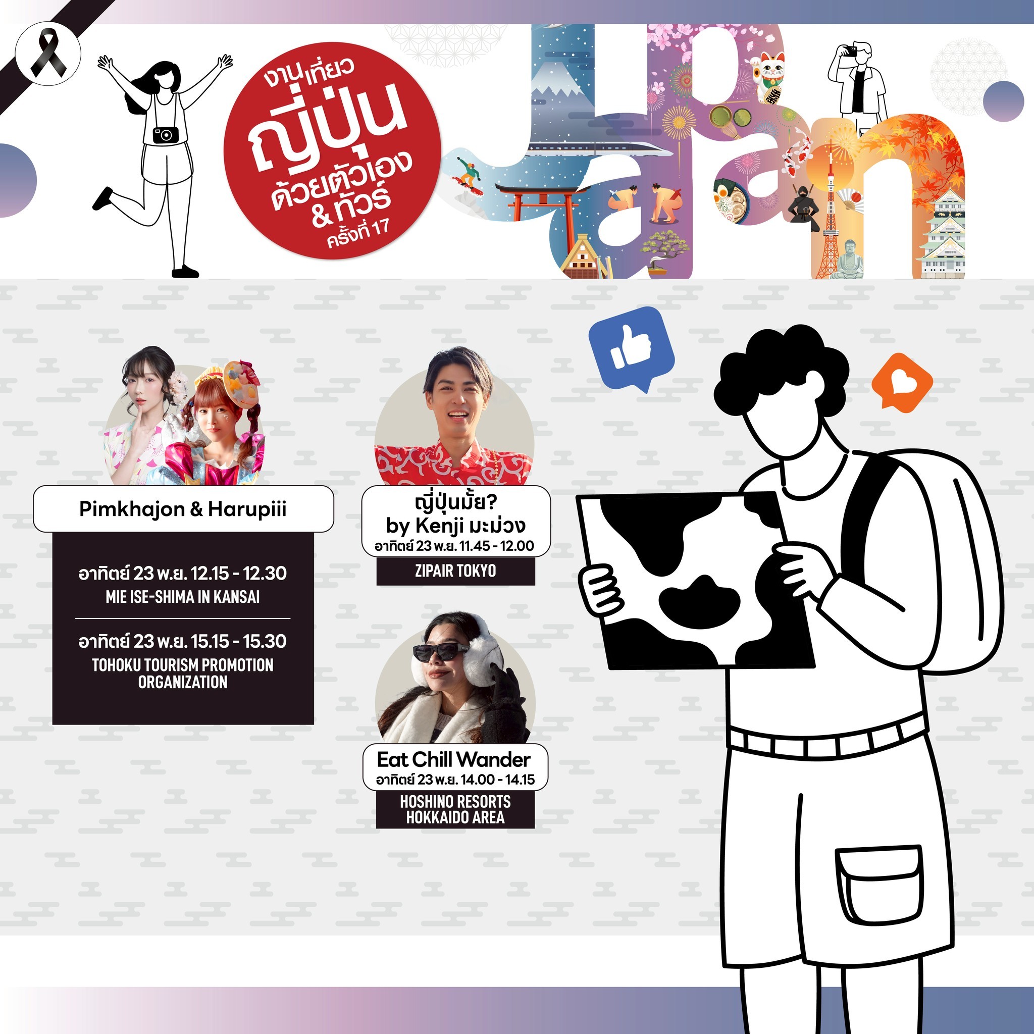 • วันอาทิตย์ที่ 23 พฤศจิกายน 2568 วันสุดท้ายของการจัดงาน พบกับเหล่า YouTuber และBlogger สายเจแปนที่จะมาเล่าประสบการณ์เที่ยวญี่ปุ่นแบบ Unseen ที่จะทำให้คุณอยากแพ็กกระเป๋าทันที อาทิ แอดอ้น แอดมินเพจGo!Graph Japan, นัท Eat Chill Wander, ฮารุปี้Harupiii, เคนจิ หรือมะม่วง ญี่ปุ่นมั้ย? by Kenjiและแขกรับเชิญพิเศษ หมอช้าง ทศพร ศรีตุลาพร้อมรับชมโชว์ “นินจา” สุดว้าวที่ส่งตรงจากประเทศญี่ปุ่น