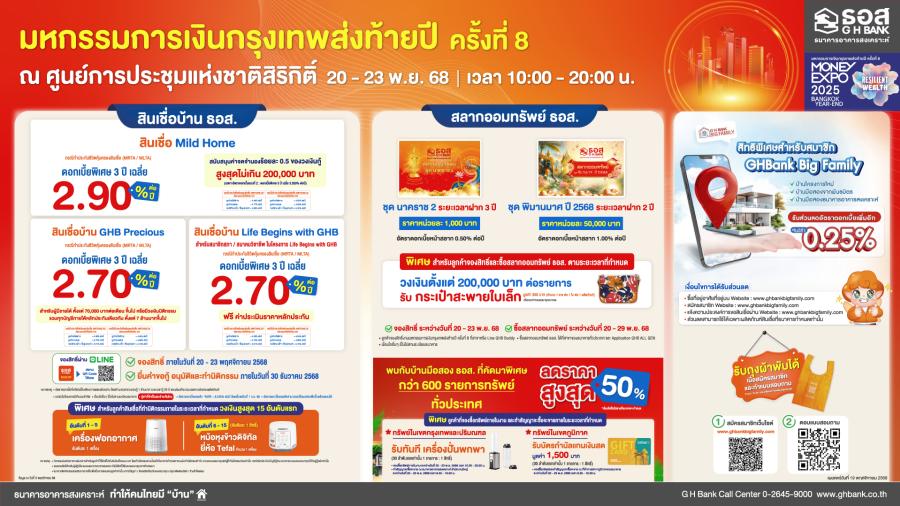 ธนาคารอาคารสงเคราะห์ (ธอส.) จัดโปรโมชันชุดใหญ่ในงาน “มหกรรมการเงินกรุงเทพส่งท้ายปี ครั้งที่ 8 (MONEY EXPO 2025 BANGKOK - YEAR END)” นำโดยดอกเบี้ยบ้านเริ่มต้นเพียง 0.72% ต่อปี นาน 6 เดือนแรก สลากออมทรัพย์ ธอส. ลุ้นโชครางวัลใหญ่สูงสุด 3 ล้านบาท และบ้านมือสองกว่า 600 รายการ ลดราคาสูงสุด 50% พร้อมของที่ระลึกภายในงานมากมาย พบกันวันที่ 20 - 23พฤศจิกายน 2568 ณ ศูนย์การประชุมแห่งชาติสิริกิติ์