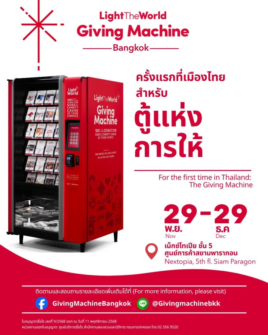โครงการ Light the World Giving Machine Bangkok จะเริ่มเปิดตัวตั้งแต่วันที่ 29 พฤศจิกายน จนถึง 29 ธันวาคม พ.ศ. 2568 ณ NEXTOPIA สยามพารากอน