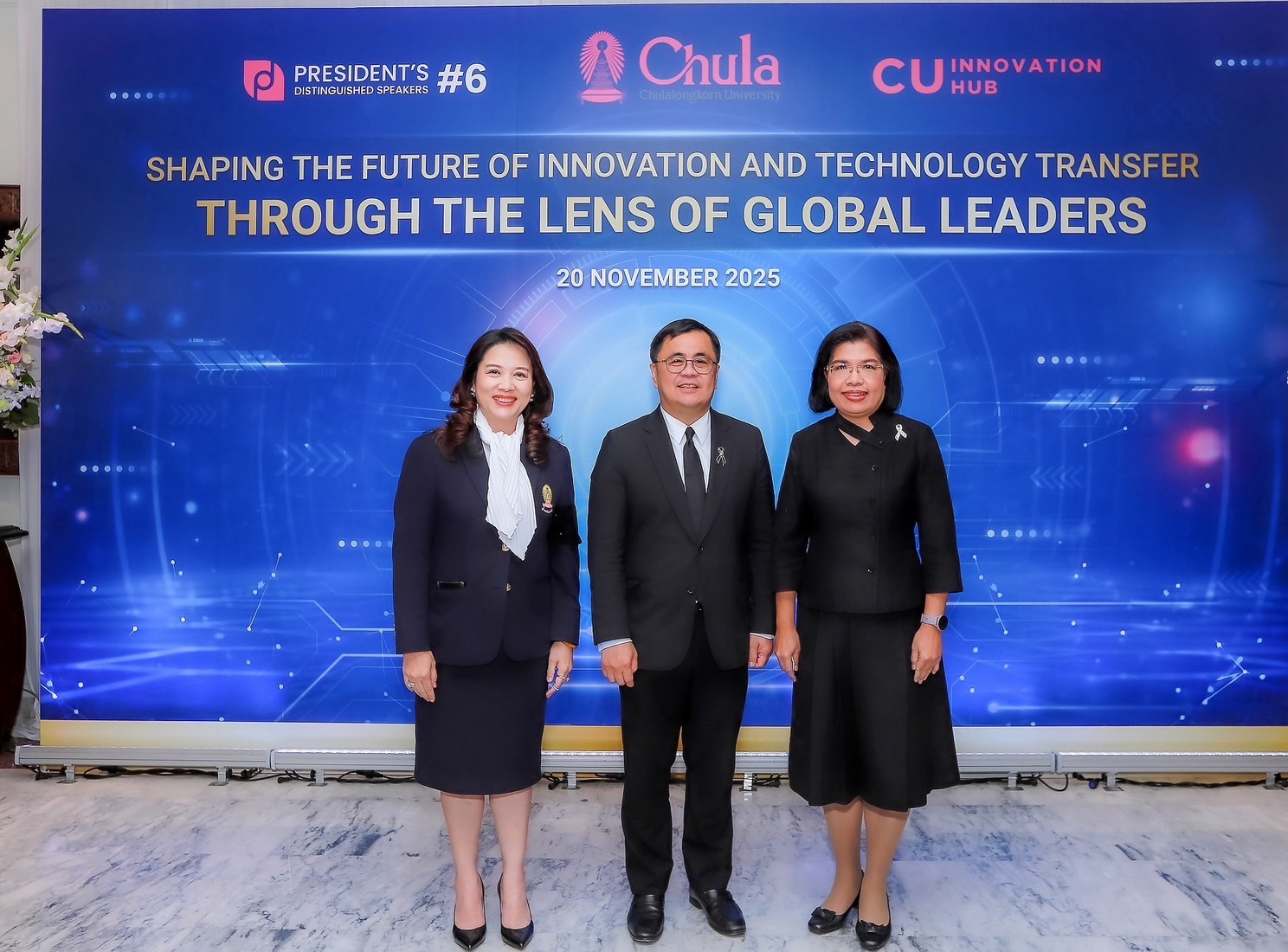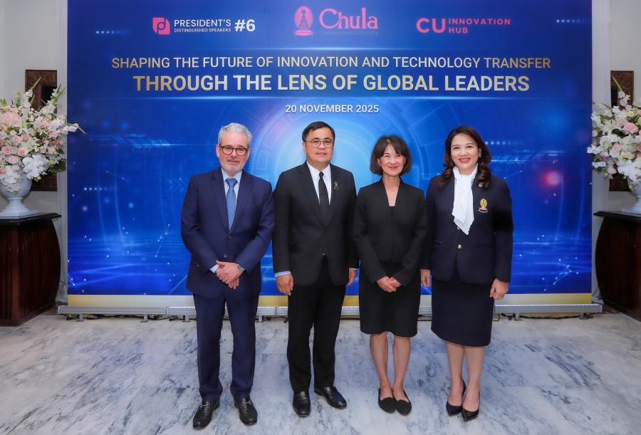 จุฬาลงกรณ์มหาวิทยาลัย ร่วมกับศูนย์กลางนวัตกรรมแห่งจุฬาลงกรณ์มหาวิทยาลัย (CU Innovation Hub) เดินหน้ายกระดับศักยภาพนวัตกรรมและทรัพย์สินทางปัญญาของประเทศ ผ่านการจัดงานเสวนา President’s Distinguished Speaker ครั้งที่ 6 “ก้าวสู่อนาคตของนวัตกรรมและการถ่ายทอดเทคโนโลยีผ่านมุมมองของผู้นำระดับโลก” โดยได้รับเกียรติจาก ศาสตราจารย์ ดร.วิเลิศ ภูริวัชร อธิการบดีจุฬาฯ กล่าวเปิดงาน จากนั้นเป็นการปาฐกถาจากผู้นำระดับโลกด้านทรัพย์สินทางปัญญา นวัตกรรมและการถ่ายทอดเทคโนโลยี คุณ Marco M. Alemán ผู้ช่วยอธิบดีองค์การทรัพย์สินทางปัญญาโลก (WIPO) และคุณ Katharine Ku อดีตผู้อำนวยการฝ่ายบริหารจาก Office of Technology Licensing จาก Stanford University มีคุณอรมน ทรัพย์ทวีธรรม อธิบดีกรมทรัพย์สินทางปัญญา พร้อมด้วยผู้บริหารมหาวิทยาลัย ผู้ทรงคุณวุฒิจากภาครัฐ และผู้บริหารระดับสูงจากภาคเอกชน มาเข้าร่วมเพื่อร่วมยกระดับผลงานวิจัยและทรัพย์สินทางปัญญาไทยสู่ตลาดโลกอย่างคับคั่ง