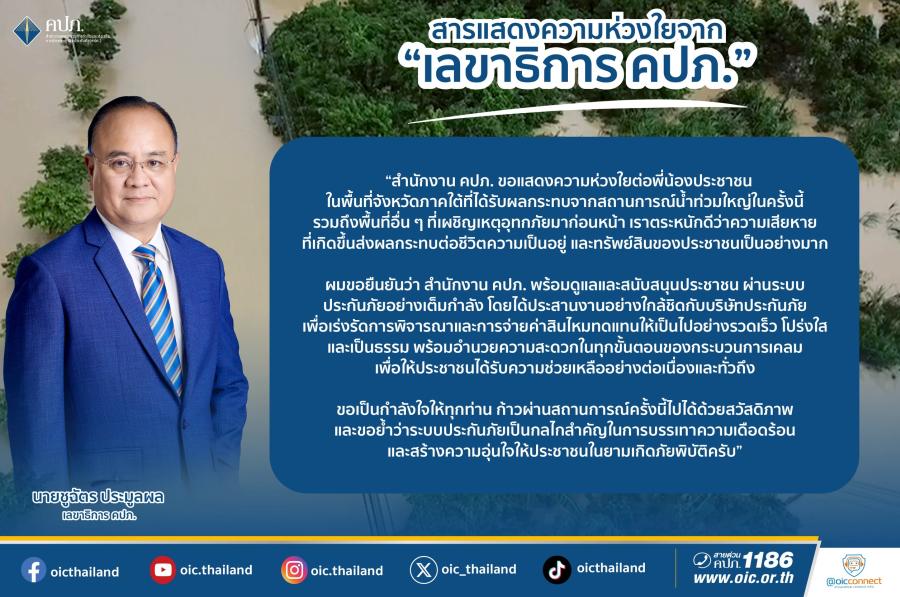 สารแสดงความห่วงใย ต่อสถานการณ์น้ำท่วมภาคใต้ จากท่านเลขาธิการ คปภ.