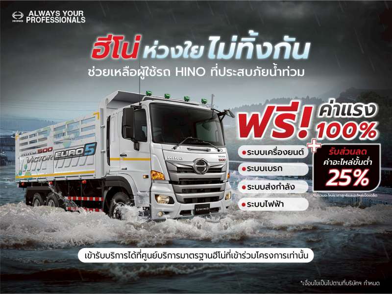 ฮีโน่ร่วมใจพร้อมช่วยเหลือผู้ประสบภัยภาคใต้ พร้อมดูแลรถบรรทุกฮีโน่ตรวจเช็กหลังน้ำท่วม ฟรี! ค่าแรง 100% และส่วนลดอะไหล่