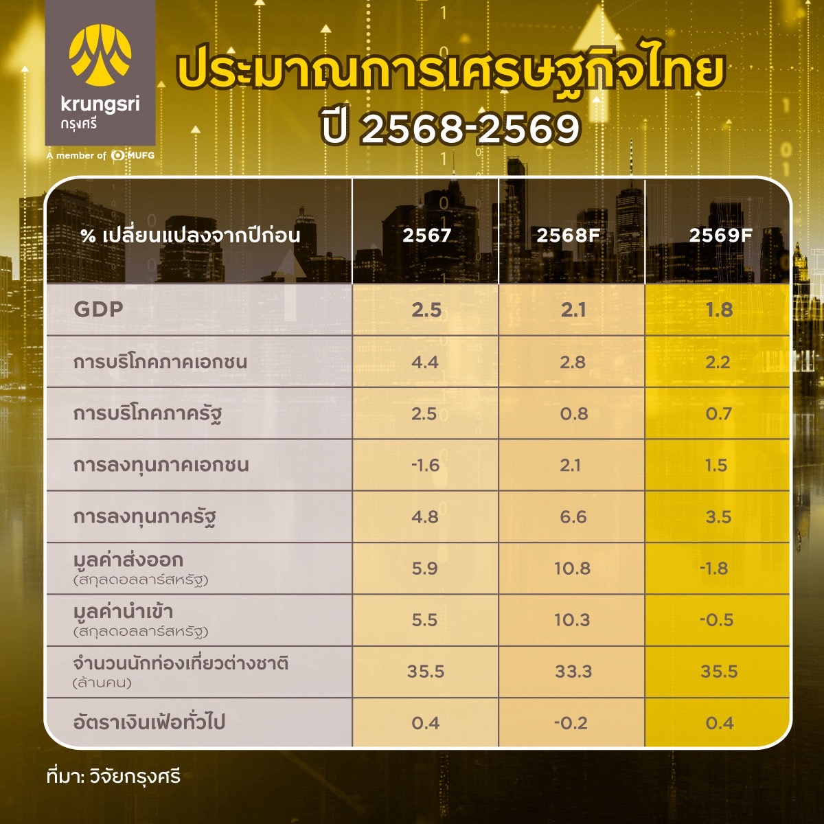 ปี 2569 กำลังจะเป็นอีกหนึ่งปีที่เศรษฐกิจไทยต้องเผชิญแรงปะทะจากรอบด้าน ทั้งแรงกดดันจากภาวะเศรษฐกิจโลกที่มีแนวโน้มชะลอตัว การดำเนินนโยบายกีดกันทางการค้าของประเทศมหาอำนาจ ตลอดจนความเปราะบางเชิงโครงสร้างภายในประเทศและความไม่แน่นอนทางการเมืองในช่วงการเลือกตั้งที่จะเกิดขึ้นอีกครั้ง ปัจจัยเหล่านี้อาจส่งผลให้เศรษฐกิจไทยในปี2569 เป็นปีของการประคองตัวมากกว่าจะเป็นปีของการเติบโตแบบเร่งตัว โดยวิจัยกรุงศรีคาดการณ์ว่าเศรษฐกิจไทยในปี 2569 จะเติบโตเพียง1.8% ชะลอลงจากปี 2568 ที่คาดว่าจะขยายตัว 2.1% เนื่องจากเครื่องยนต์สำคัญหลายด้านมีแนวโน้มแผ่วลง ไม่ว่าจะเป็นการส่งออก การบริโภค การลงทุนภาคเอกชน และการใช้จ่ายภาครัฐ โดยทิศทางของปัจจัยขับเคลื่อนเศรษฐกิจสำคัญมีดังนี้