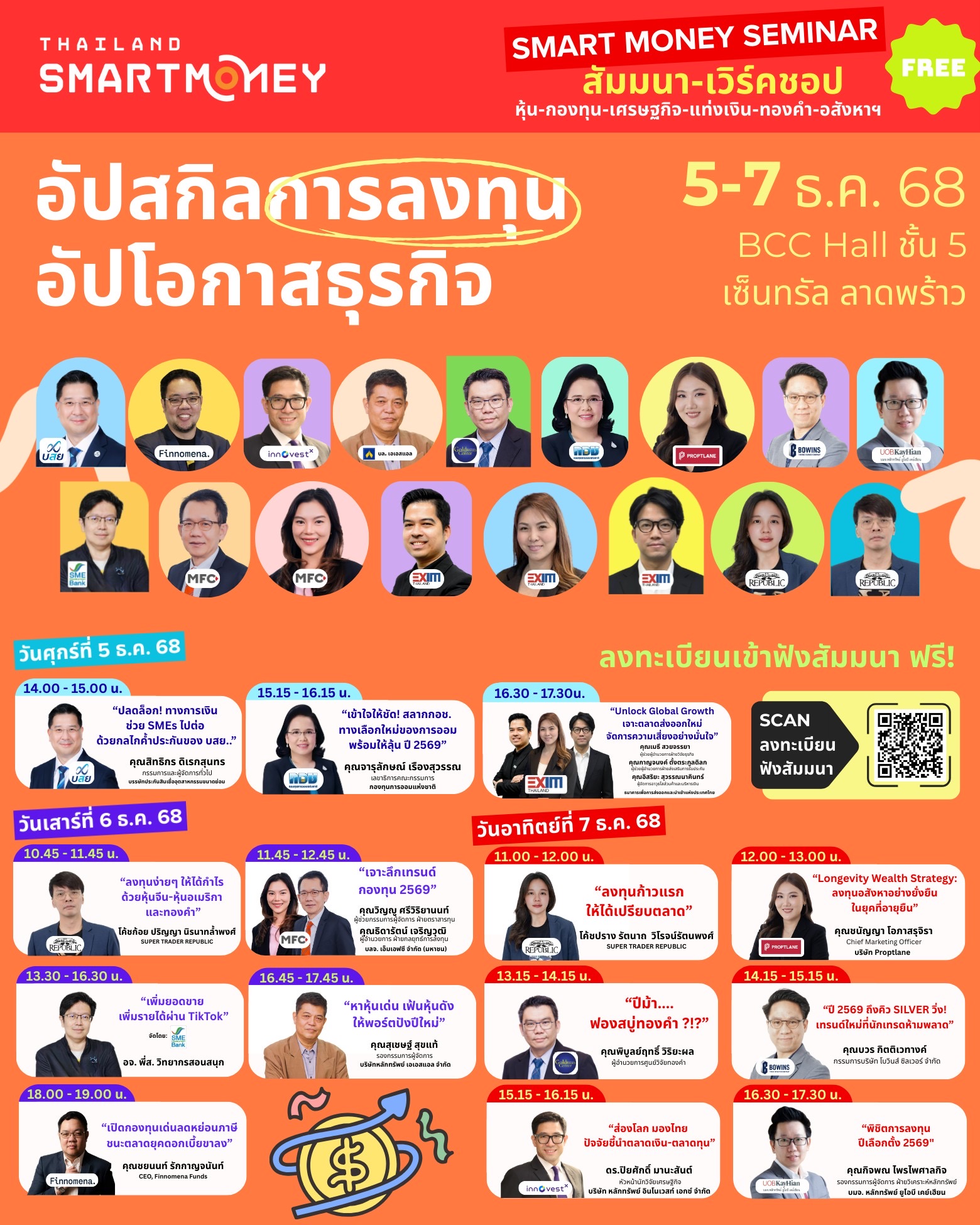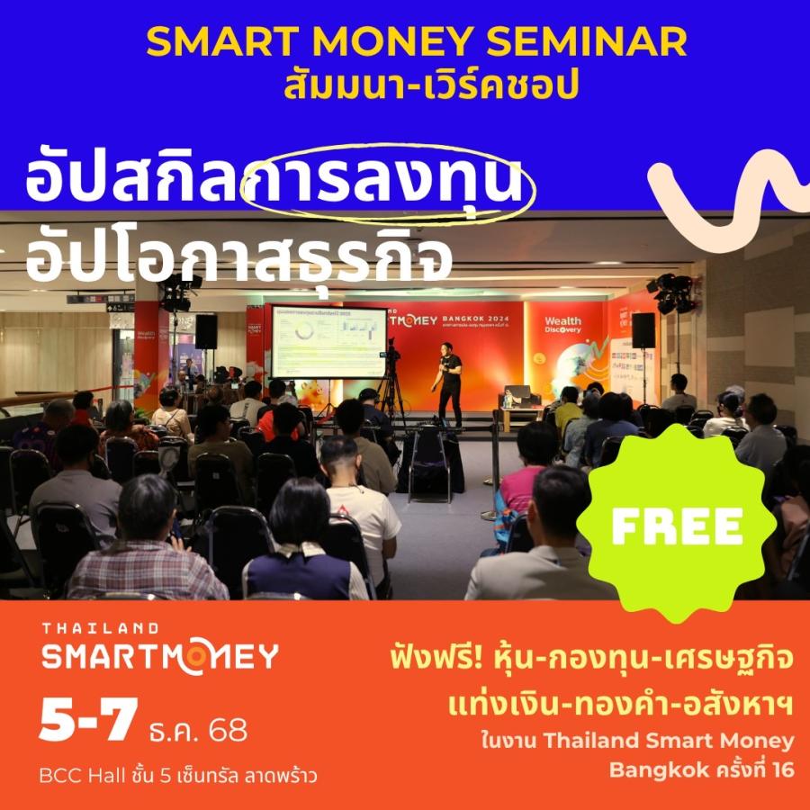 Thailand Smart Money Bangkok ครั้งที่ 16เตรียมจัดงานภายใต้แนวคิด ”Sustainable Investing” การลงทุนเพื่อการเปลี่ยนแปลง ขนสถาบันการเงิน มอบข้อเสนอพิเศษ ครบทุกโอกาสสร้างผลตอบแทน พร้อมปรึกษาวางแผนภาษีสุดคุ้ม พบกับตัวจริงการเงิน-ลงทุน อัดแน่นความรู้และความคุ้มค่าด้านการลงทุนตลอด 3 วัน ลงทะเบียนรับของที่ระลึกฟรี ลุ้นรับรางวัลใหญ่ภายในงาน ระหว่าง5 - 7 ธ.ค. 68 ณ BCC Hall ชั้น 5 เซ็นทรัล ลาดพร้าว