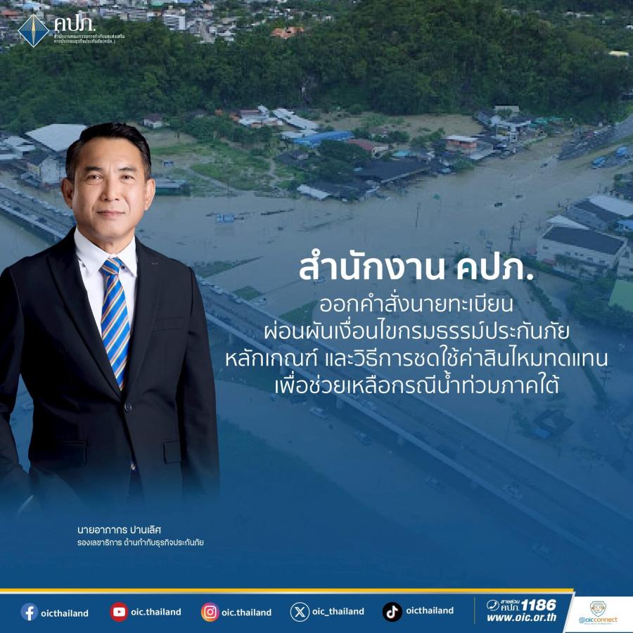 สำนักงานคณะกรรมการกำกับและส่งเสริมการประกอบธุรกิจประกันภัย (สำนักงาน คปภ.) ได้ออกมาตรการเร่งด่วน เพื่อช่วยเหลือและบรรเทาความเดือดร้อนแก่ผู้เอาประกันภัยที่ได้รับผลกระทบจากเหตุอุทกภัยในพื้นที่ภาคใต้ โดยเมื่อวันที่ 2 ธันวาคม 2568 สำนักงาน คปภ. ได้เชิญนายกสมาคมประกันชีวิตไทย นายกสมาคมประกันวินาศภัยไทย และผู้แทนบริษัทสมาชิกเข้าร่วมประชุมหารือ เพื่อกำหนดแนวทางการให้ความช่วยเหลืออย่างเร่งด่วนและเป็นรูปธรรม