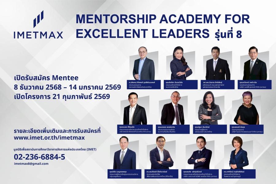 การเปิดรับสมัครเมนที (Mentee) โครงการ IMET MAX รุ่นที่ 8 เริ่มตั้งแต่วันนี้จนถึงวันที่ 14 มกราคม 2569 โดยจะคัดเลือกจากผู้นำรุ่นใหม่อายุระหว่าง 35-45 ปี ซึ่งมีความหลากหลายในกลุ่มอาชีพ ได้แก่ ผู้นำธุรกิจ ทายาทธุรกิจ ข้าราชการ ผู้บริหารบริษัทเอกชน และผู้นำองค์กรธุรกิจเพื่อสังคม โดยจะต้องมีคุณสมบัติสำคัญ 3 ประการ ได้แก่ 1. เป็นผู้นำที่มีศักยภาพสูงสามารถสร้างผลกระทบเชิงบวกให้สังคมในวงกว้าง 2. เป็นคนดีที่มีคุณธรรมและจริยธรรมและ 3. ผู้สมัครมีคำถามสำคัญในชีวิตที่ยังไม่ได้รับคำตอบ โดยเชื่อว่ากระบวนการ Mentoring สามารถช่วยค้นหาคำตอบได้ ซึ่งถือเป็นหัวใจสำคัญของการสร้าง “ผู้นำ” ที่มีทั้งความดี และความเก่ง ส่งต่อคุณค่าที่ดีสู่สังคมได้