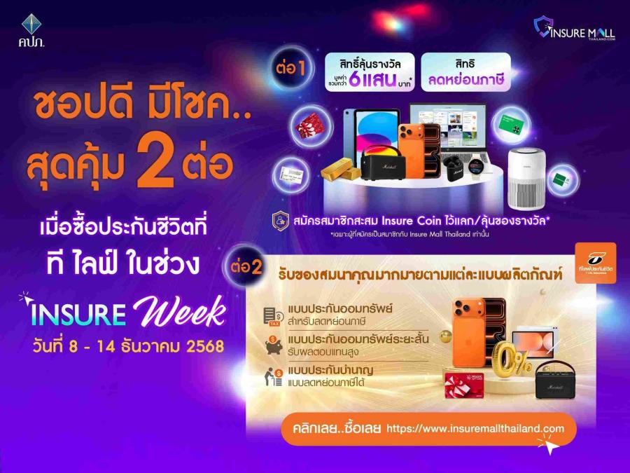นอกจากนี้ Insure Mall Thailand ยังจัดโปรโมชั่นสุดพิเศษสำหรับลูกค้าที่ซื้อประกันชีวิตในช่วง “Insure Week” วันที่ 8 – 14 ธันวาคม 2568 รับสิทธิ์ลุ้นของรางวัลใหญ่รวมมูลค่ากว่า 600,000 บาท เพื่อเป็นของขวัญส่งท้ายปีให้แก่ผู้ที่วางแผนอนาคตอย่างมั่นใจ