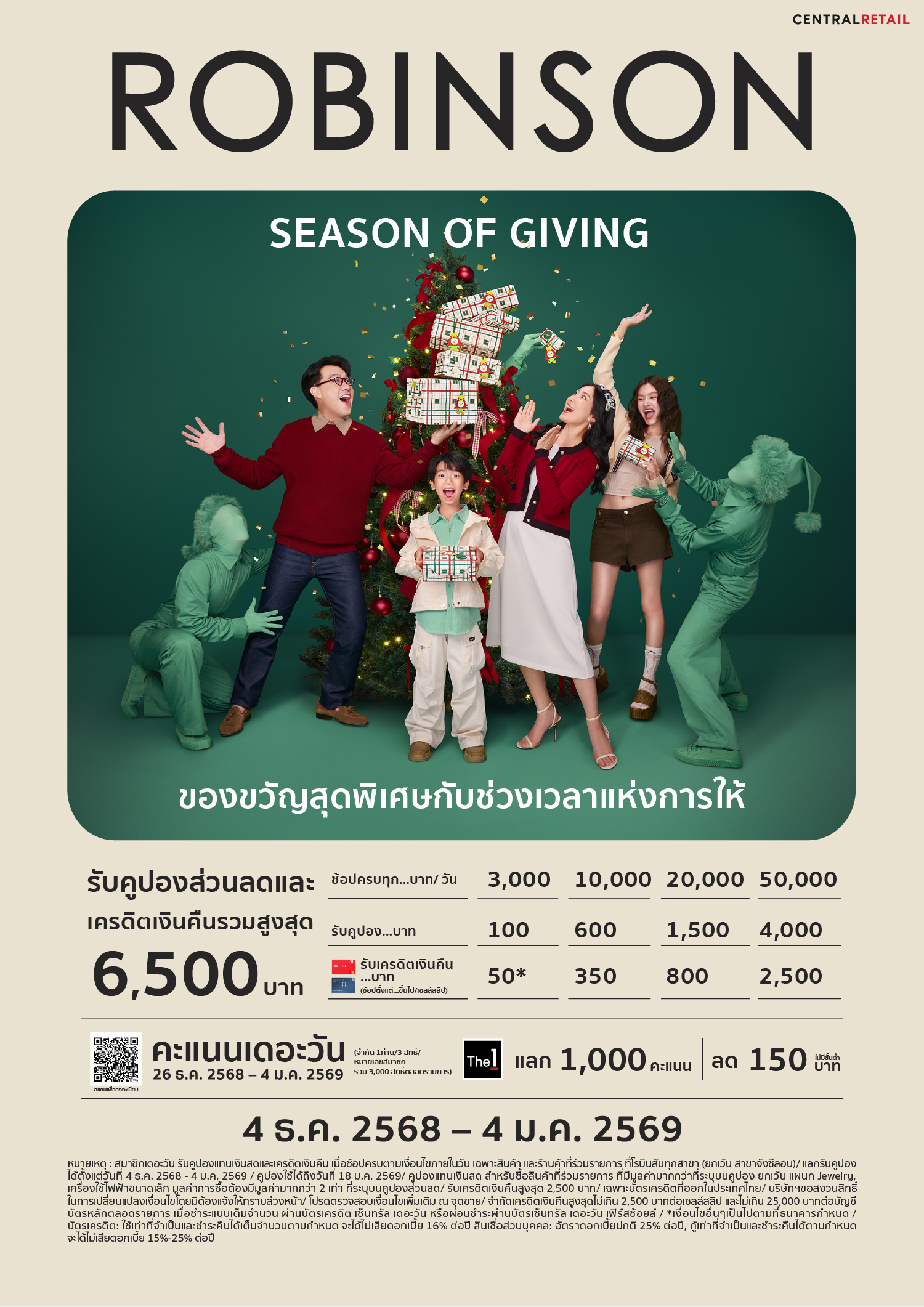 ห้างโรบินสัน ในเครือเซ็นทรัล รีเทล ตอกย้ำความเป็น “เดสติเนชันที่สร้างความสุขในทุกวันของชีวิต” เดินหน้าเติมความสุขต่อเนื่องต้อนรับเทศกาลปีใหม่ในแคมเปญ “ROBINSON SEASON OF GIVING” (โรบินสัน ซีซั่น ออฟ กิฟวิ่ง) ภายใต้คอนเซ็ปต์ “ของขวัญสุดพิเศษ กับช่วงเวลาแห่งการให้” ที่มาพร้อมไอเทมของขวัญชิ้นเด็ดจากแบรนด์ชั้นนำ โปรโมชันสุดคุ้ม กิจกรรมสนุก ๆ พร้อมส่งต่อความสุขให้สังคมในบรรยากาศสุดอบอุ่น ตั้งแต่วันนี้ – 4 ม.ค. 69 ที่ห้างโรบินสันทุกสาขา รวมถึงช่องทางการช้อปปิ้งสุดสะดวกของห้างฯ