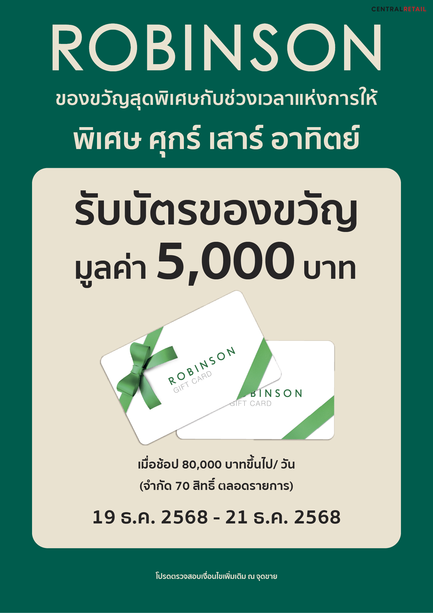 · พิเศษเฉพาะสุดสัปดาห์ วันที่ 19–21 ธ.ค. 68 ช้อปครบ 80,000 บาทขึ้นไป/วัน รับบัตรของขวัญ 5,000 บาท (จำกัด 70 สิทธิ์)
