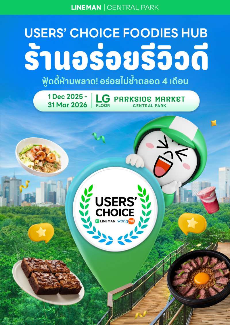 สายกินเตรียมปักหมุด! เซ็นทรัล พาร์ค จับมือ LINE MAN Wongnai เปิดตัวแคมเปญสุดเอ็กซ์คลูซีฟ “LINE MAN Wongnai Users’ Choice x Central Park FOODIES HUB” เนรมิตโซนParkside Market ชั้น LG ให้กลายเป็นศูนย์รวมร้านอร่อยระดับรางวัล Users’ Choice กว่า 50 ร้านดังจากทั่วประเทศ มาไว้ในที่เดียว ใจกลาง Super Core CBD ให้สายฟู้ดได้ตะลุยชิมแบบครบ จบทั้งกิน–ช้อป–ชิลล์ ต่อเนื่องยาวถึง 4 เดือนเต็ม ตั้งแต่วันนี้ – 31 มีนาคม 2569 พร้อมชวนทุกคนมาเปิดประสบการณ์ความอร่อยแบบ ครบทุกสไตล์ ทุกช่องทาง จะสั่ง Delivery ผ่าน LINE MAN มาฟินที่บ้านก็ได้ จะสั่งล่วงหน้าแล้วแวะรับแบบ Pick & Go ก็สะดวกรวดเร็ว หรืออยากออกมาสัมผัสบรรยากาศและลิ้มลองด้วยตัวเองที่ Parkside Market ก็เดินทางง่ายสุด ๆ ด้วยบริการเรียกรถ LINE MAN RIDE ครบจบทุกทริปของสายกิน สะท้อนวิสัยทัศน์ของ Central Park ในการยกระดับกรุงเทพฯ สู่การเป็น ‘Culinary Landmark of Asia’ ผ่านการสร้าง Food Destination ที่เชื่อมโยงคนเมือง ครอบครัว และนักท่องเที่ยวจากทั่วโลก ผสานจุดแข็งของ LINE MAN Wongnai และมาตรฐานรางวัล Users’ Choice จากเสียงนักชิมจริงทั่วประเทศ เพื่อร่วมกันผลักดันกรุงเทพฯ ให้ก้าวสู่หนึ่งใน Food Destination ชั้นนำระดับโลก