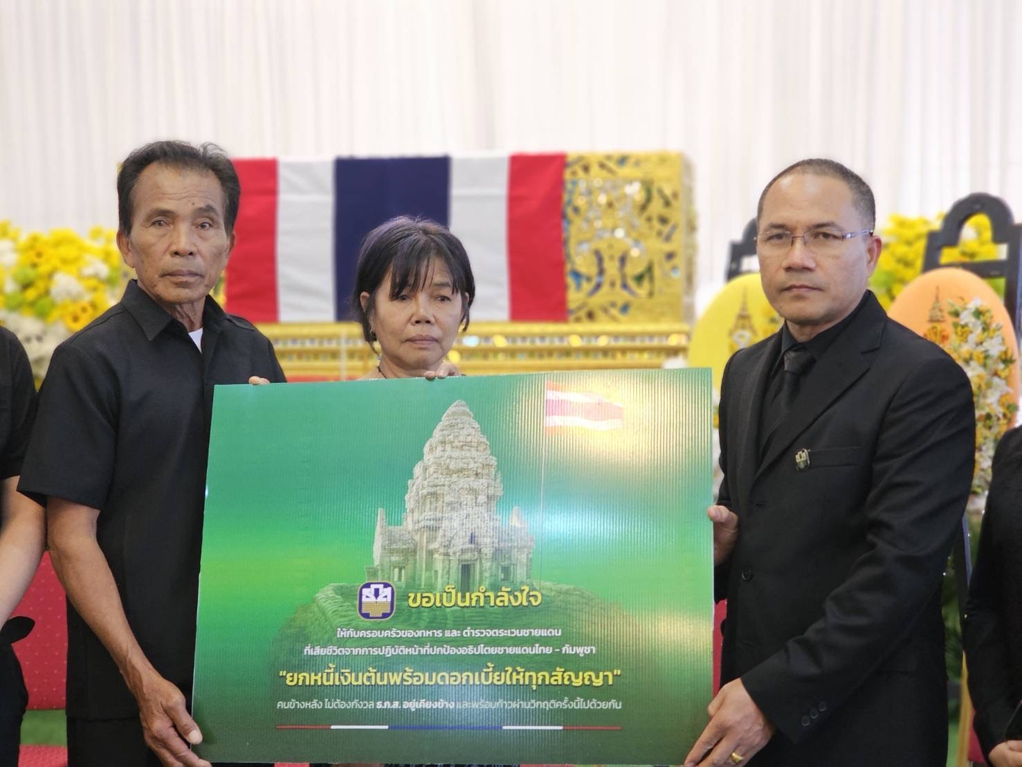 ทั้งนี้เพื่อให้ความช่วยเหลือลูกค้า ธ.ก.ส. และลดภาระให้สามารถดำรงชีพต่อไปได้อย่างมั่นคง โดยกรณีทหารหรือตำรวจตระเวนชายแดน (ตชด.) ที่เสียชีวิตจากการปฏิบัติหน้าที่ในเหตุการณ์ความไม่สงบระหว่างประเทศไทย – กัมพูชา ที่เป็นลูกค้า ธ.ก.ส. รวมถึง บิดา มารดา หรือคู่สมรสที่เป็นลูกค้าธ.ก.ส. ของวีรบุรุษผู้เสียสละชีวิตจากการปฏิบัติหน้าที่ ธนาคารจะยกหนี้ในส่วนของต้นเงินกู้ทุกสัญญาและยกหนี้ในส่วนของดอกเบี้ยค้างรับและดอกเบี้ยปรับทั้งจำนวน ภายใต้สัญญาที่ใช้แหล่งเงินทุน ธ.ก.ส. เป็นกรณีพิเศษ