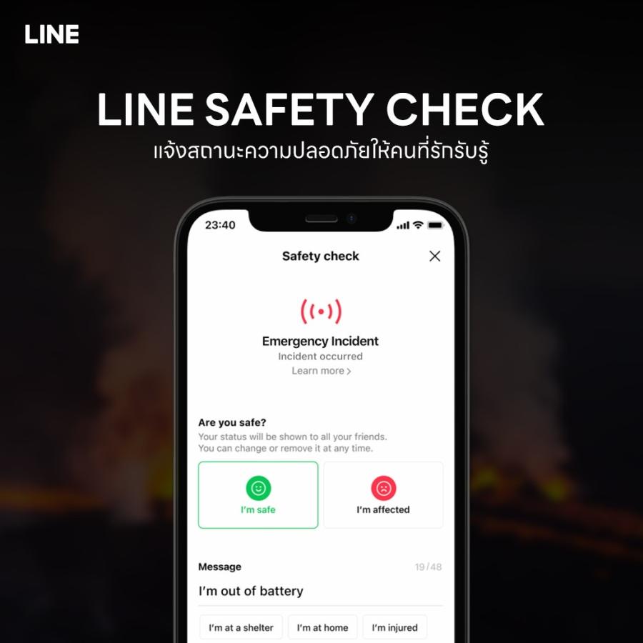 LINE Safety Check คือ ฟีเจอร์ยืนยันความปลอดภัยที่ LINE พัฒนาขึ้นเพื่อให้ประชาชนสามารถแจ้ง”สถานะความปลอดภัย”ของตนเอง ได้ทันทีเมื่อเกิดเหตุภัยพิบัติ ผ่านแพลตฟอร์ม LINE ที่ใช้งานอยู่ทุกวัน โดยระบบจะแสดงแบนเนอร์แจ้งเตือนภายในแอปเมื่อเกิดเหตุภัยพิบัติ ผ่านการรับข้อมูลที่รับรองจากหน่วยงานภาครัฐที่เกี่ยวข้อง ลดความเสี่ยงจากข่าวลวงหรือข้อมูลคลาดเคลื่อน ผู้ใช้สามารถกดรายงานสถานะของตนเอง ซึ่งเพื่อนบน LINE ไม่ว่าจะเป็นครอบครัวและคนใกล้ชิดจะสามารถเห็นได้อย่างรวดเร็วและชัดเจน โดยฟีเจอร์นี้ได้รับการออกแบบให้ใช้งานง่าย ไม่ต้องติดตั้งหรือสมัครบริการเพิ่มเติม และมีชุดข้อความพร้อมใช้ตามลักษณะเหตุการณ์ รวมถึงมีข้อมูลข่าวสารเกี่ยวสถานการณ์ที่ได้รับการตรวจสอบความน่าชื่อถือแล้ว เพื่อช่วยให้การสื่อสารในช่วงสถานการณ์วิกฤติเป็นไปอย่างถูกต้องและมีประสิทธิภาพ