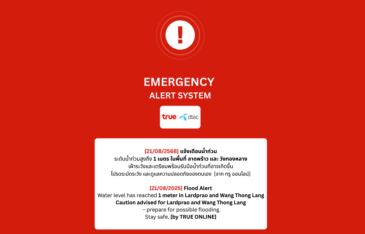 เหตุฉุกเฉินสามารถเกิดขึ้นได้ทุกเมื่อ...ความรวดเร็วของการรับรู้ข้อมูล คือสิ่งที่สร้างความแตกต่างอย่างแท้จริง Cell Broadcast Service Online (CBSO) นวัตกรรมรางวัลรองชนะเลิศอันดับที่ 1 ประเภท Proof of Concept เกิดขึ้นจากความตั้งใจของทีมทรู ที่จะยกระดับระบบการแจ้งเตือนภัยของประเทศให้เข้าถึงประชาชนได้ครอบคลุมยิ่งขึ้น ไม่จำกัดเพียงโทรศัพท์มือถือ หรือพื้นที่ที่สัญญาณเครือข่ายอาจเข้าไม่ถึง เพราะในชีวิตจริง ยังมีอีกหลายครอบครัวที่อาจพลาดสัญญาณเตือนสำคัญในช่วงเวลาวิกฤต ระบบยังสามารถแจ้งเตือนเฉพาะพื้นที่ที่ได้รับผลกระทบจริง รองรับผู้ใช้งานจำนวนมาก และต่อยอดสู่การแจ้งเตือนผ่านทีวีหรืออุปกรณ์ IoT ในอนาคต CBSO จึงไม่ใช่แค่นวัตกรรมด้านเทคโนโลยี แต่เป็นอีกก้าวของทรูในการนำศักยภาพโครงสร้างพื้นฐานที่มีอยู่ มาเพิ่มความปลอดภัยให้แก่คนในสังคมไทยได้มั่นใจมากยิ่งขึ้น