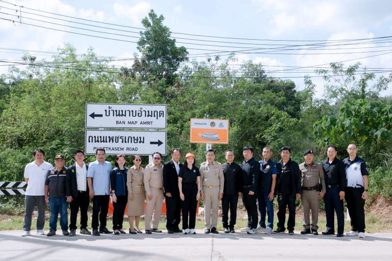 ธนชาตประกันภัย จึงสนับสนุนงบประมาณ จำนวน 200,000 บาท ให้แก่เทศบาลตำบลมาบอำมฤต เพื่อจัดให้มีอุปกรณ์ลดจุดเสี่ยงบนถนน และอาณัติสัญญาณด้านความปลอดภัยทางถนน จำนวนทั้งสิ้น 8 รายการ ประกอบด้วย ไฟกระพริบ, ป้ายแบบ ต.13 (ป้ายเตือนทางแยก), ป้ายแบบ บ.54 (ป้ายบังคับความเร็วขั้นต่ำ) จำนวน 1 ชุด, ไฟกระพริบ, ป้ายแบบ ต.14 (ป้ายเตือนทางแยก) จำนวน 1 ชุด, ไฟกระพริบ, ป้ายแบบ บ.1 (ป้ายบังคับหยุด) จำนวน 1 ชุด, ป้ายบอกทาง แบบ น.2 (2 แผ่นป้าย/ชุด) จำนวน 1 ชุด, ป้ายแบบ ต.63 /ต.66 เตือนแนวทาง (2 แผ่นป้าย/ชุด) จำนวน 3 ชุด, ป้ายแบบ ต.63/ต.66 เตือนแนวทาง แบบพลังงานแสงอาทิตย์ (2 แผ่นป้าย/ชุด) จำนวน 2 ชุด, แผงไม้กั้นถนน จำนวน 12 เมตร, หมุดลูกแก้วสะท้อนแสง พลังงานแสงอาทิตย์ จำนวน 30 ดวง
