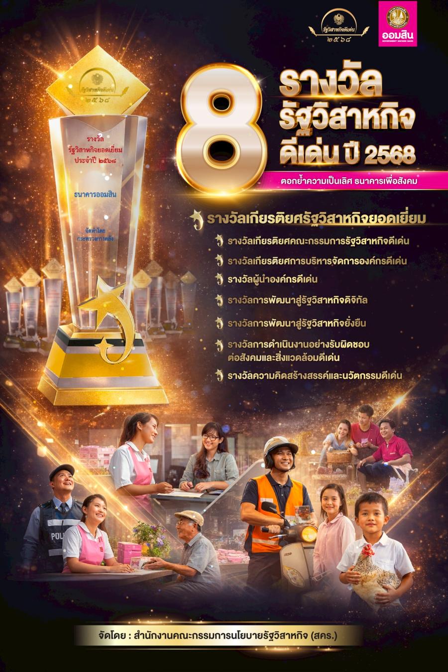 ออมสิน กวาด 8 รางวัล “รัฐวิสาหกิจดีเด่น” ปี 68 ผลงานดีสุดในประวัติศาสตร์ธนาคาร คว้าสุดยอดรัฐวิสาหกิจยอดเยี่ยม 3 ปีซ้อน และรางวัลเกียรติยศการบริหารจัดการองค์กรดีเด่นต่อเนื่องปีที่ 7 ตอกย้ำความเป็นเลิศธนาคารเพื่อสังคม