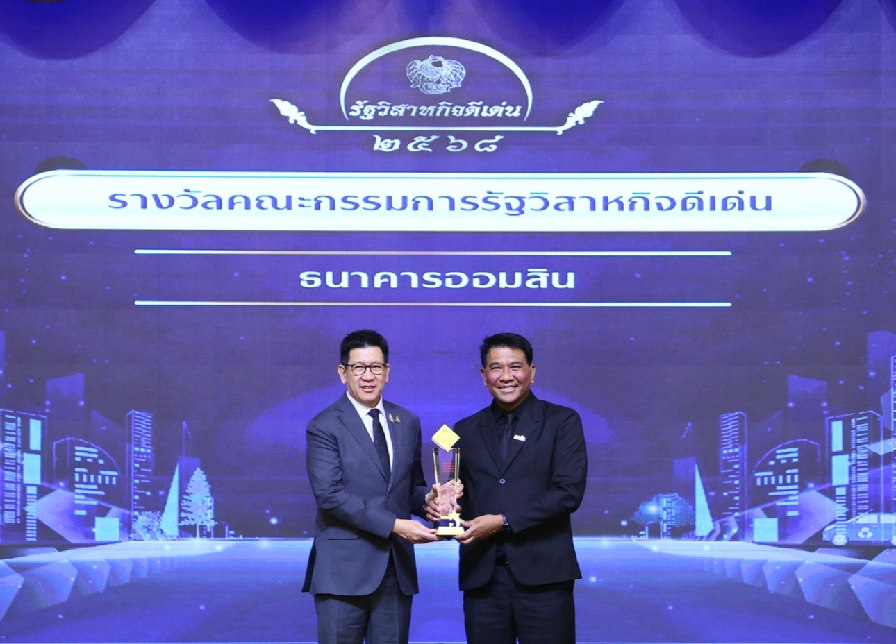 นายเอกนิติ นิติทัณฑ์ประภาศ รองนายกรัฐมนตรีและรัฐมนตรีว่าการกระทรวงการคลัง มอบรางวัลรัฐวิสาหกิจดีเด่น (SOE Awards) ประจำปี 2568 ให้แก่ธนาคารออมสิน โดยมีผู้แทนรับมอบรางวัลได้แก่รศ.ดร. ธนวรรธน์ พลวิชัย กรรมการธนาคารออมสินพร้อมด้วย นางลภาวรรณ จันทร์กระจ่าง รองผู้อำนวยการธนาคารออมสิน รักษาการแทนผู้อำนวยการธนาคารออมสิน และผู้บริหาร ซึ่งเป็นปีที่ธนาคารออมสินได้รางวัลในระดับดีเด่นและเกียรติยศ ครบทั้ง 8 ประเภทรางวัลที่ธนาคารได้รับ จัดขึ้นโดยคณะกรรมการนโยบายรัฐวิสาหกิจ (สคร.) กระทรวงการคลัง ณ ตึกสันติไมตรี ทำเนียบรัฐบาล เมื่อวันที่ 22ธันวาคม 2568