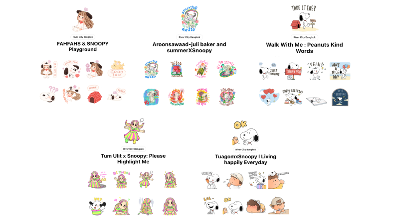 คอลเลกชัน LINE STICKERS พิเศษในโปรเจกต์ “How Do You Do, Snoopy? 75 Years: A Journey of Friendship Through Art” เป็นการนำเสนอคาแรกเตอร์ Snoopy ในมุมมองใหม่ผ่านลายเส้นอันเป็นเอกลักษณ์ของ 5 ศิลปินไทยชื่อดัง ได้แก่ FAHFAHS เจ้าของคาแรกเตอร์เด็กผู้หญิงตาโตในโทนสีพาสเทลอ่อนโยนสุดอบอุ่น, Tum Ulit ศิลปินผู้ถ่ายทอดสไตล์ผลงานที่น่ารัก เรียบง่าย ในรูปแบบสีหม่น ๆ สื่อถึงความเหงาและความเปราะบาง, Juli Baker and Summer กับงานเพนต์ลายเส้นอิสระที่โดดเด่นด้านการใช้สีสันสดใสเต็มไปด้วยพลังบวก, Tuagomstudio เจ้าของคาแรกเตอร์ ”ตัวกลม” ที่ดูเป็นมิตรกับทุกคน และ Munins ผู้ถ่ายทอดความนุ่มละมุนในสไตล์มินิมัลที่ลึกซึ้งกินใจ