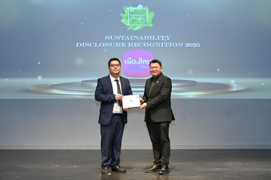 บริษัท เมืองไทยประกันชีวิต จำกัด (มหาชน) รับรางวัลประกาศเกียรติคุณ (Sustainability Disclosure Recognition) ประจำปี 2568 ในพิธีมอบรางวัลการเปิดเผยข้อมูลความยั่งยืนประจำปี 2568 จัดโดยสถาบันไทยพัฒน์ สะท้อนความมุ่งมั่นในการเป็นองค์กรที่เปิดเผยข้อมูลด้านความยั่งยืนอย่างโปร่งใสรอบด้าน มีคุณภาพ และสอดคล้องตามเป้าหมายการพัฒนาที่ยั่งยืน (SDGs)