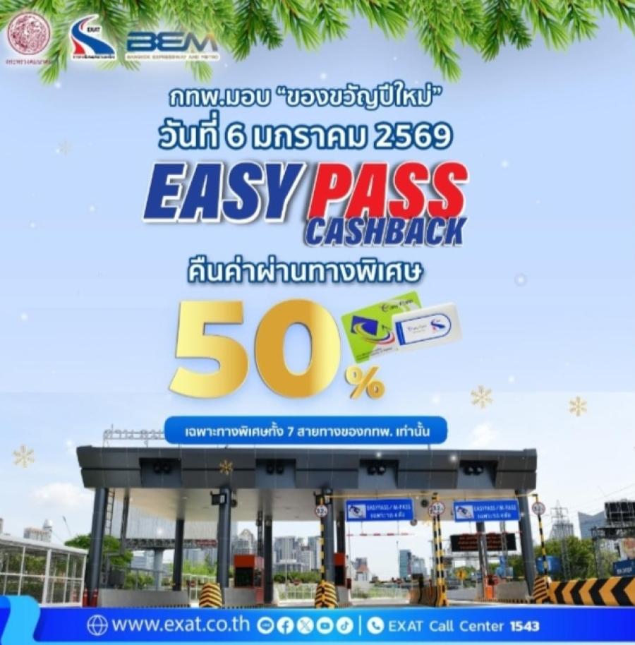 6 มกราคม 2569 กทพ. เตรียมมอบของขวัญต้อนรับปีใหม่ กับแคมเปญ “EASY PASS…Cashback” คืนค่าผ่านทาง 50%