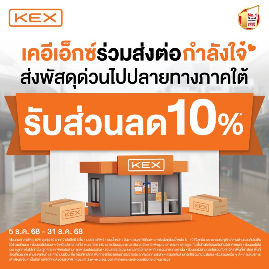 แม้สภาพอากาศจะส่งผลต่อการคมนาคมในบางพื้นที่ KEX ยืนหยัดดำเนินงานภายใต้ความพร้อมของเครือข่าย การบริหารจัดการกำลังการให้บริการเชิงรุก และการประสานงานในพื้นที่อย่างใกล้ชิด เพื่ออำนวยความสะดวกให้ลูกค้าสามารถจัดส่งสิ่งของจำเป็นไปยังภาคใต้ได้อย่างมั่นใจ พร้อมรองรับความต้องการจัดส่งที่เพิ่มขึ้นในช่วงเวลาดังกล่าว และมอบส่วนลดค่าส่งทันที 10%* เพื่อช่วยแบ่งเบาภาระค่าใช้จ่ายให้แก่ครัวเรือน ภาคธุรกิจ และหน่วยงานต่างๆ ในช่วงของการฟื้นฟู