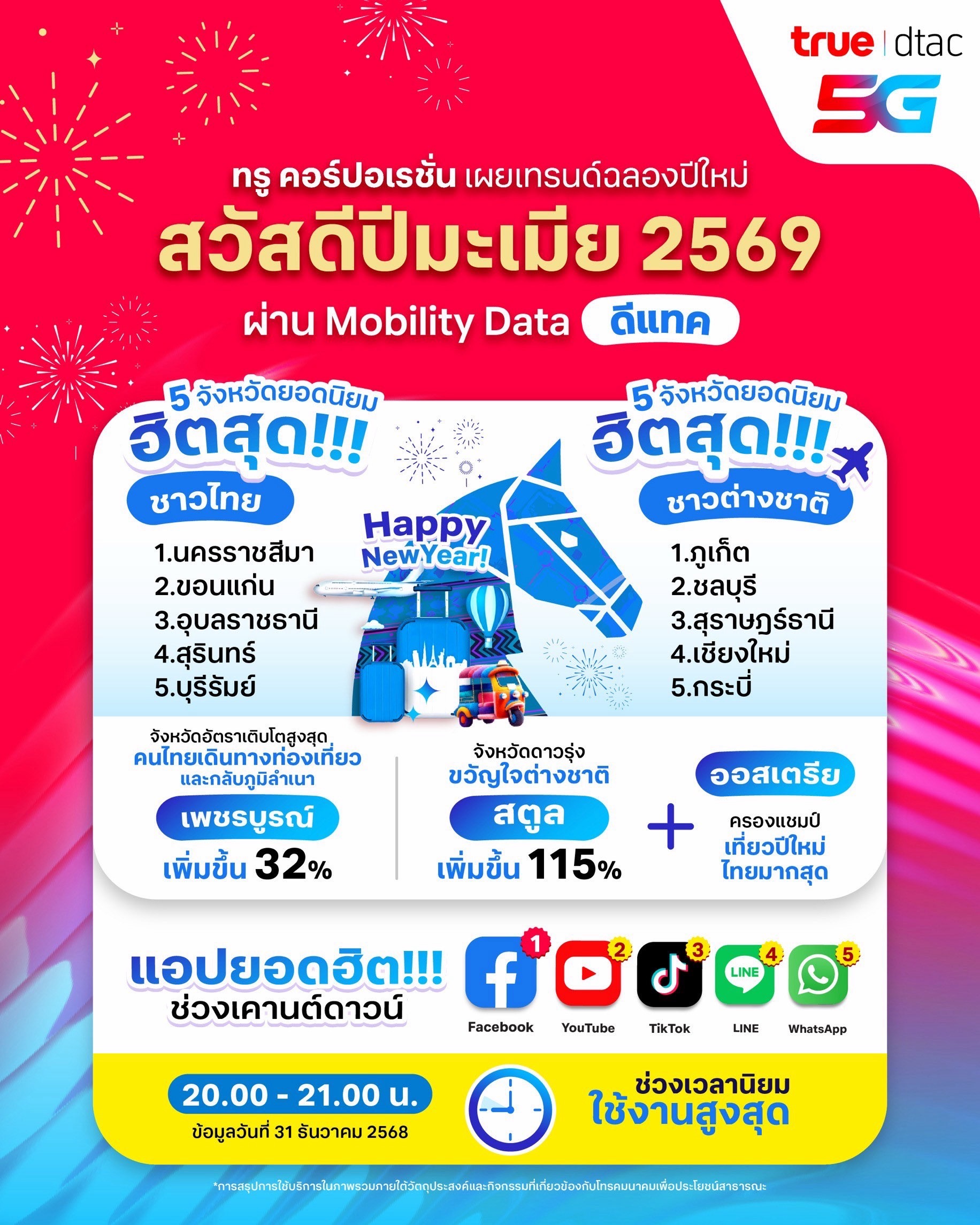 นอกจากนี้ ทรู คอร์ปอเรชั่น ได้รายงาน 5 จังหวัดท่องเที่ยวยอดนิยมของคนไทยและต่างชาติจาก Mobility Data พร้อมเผย 5 แอปพลิเคชันยอดฮิตที่ครองการใช้งานทั้งมือถือและเน็ตบ้านในคืนข้ามปี ขณะที่แอปทรูไอดี (TrueID) มียอดผู้ใช้งานรวมในช่วงเทศกาลเพิ่มขึ้นราว 110% เมื่อเทียบกับช่วงปกติ สะท้อนบทบาทการใช้งานและความนิยมคอนเทนต์วิดีโอและเอนเตอร์เทนเมนต์ในช่วงเวลาส่งท้ายปีเก่าต้อนรับปีใหม่