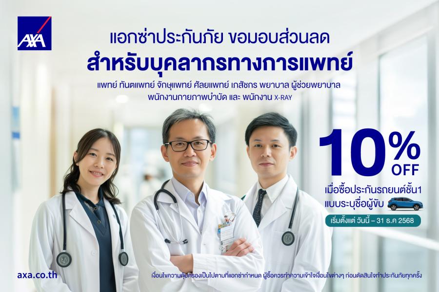 – แอกซ่าประกันภัย เปิดตัวโปรโมชันพิเศษ มอบส่วนลด 10% สำหรับแผนประกันรถยนต์ชั้น 1 (กรมธรรม์ระบุชื่อผู้ขับขี่) แก่บุคลากรทางการแพทย์ ตั้งแต่วันนี้จนถึง 31 ธันวาคม 2568
