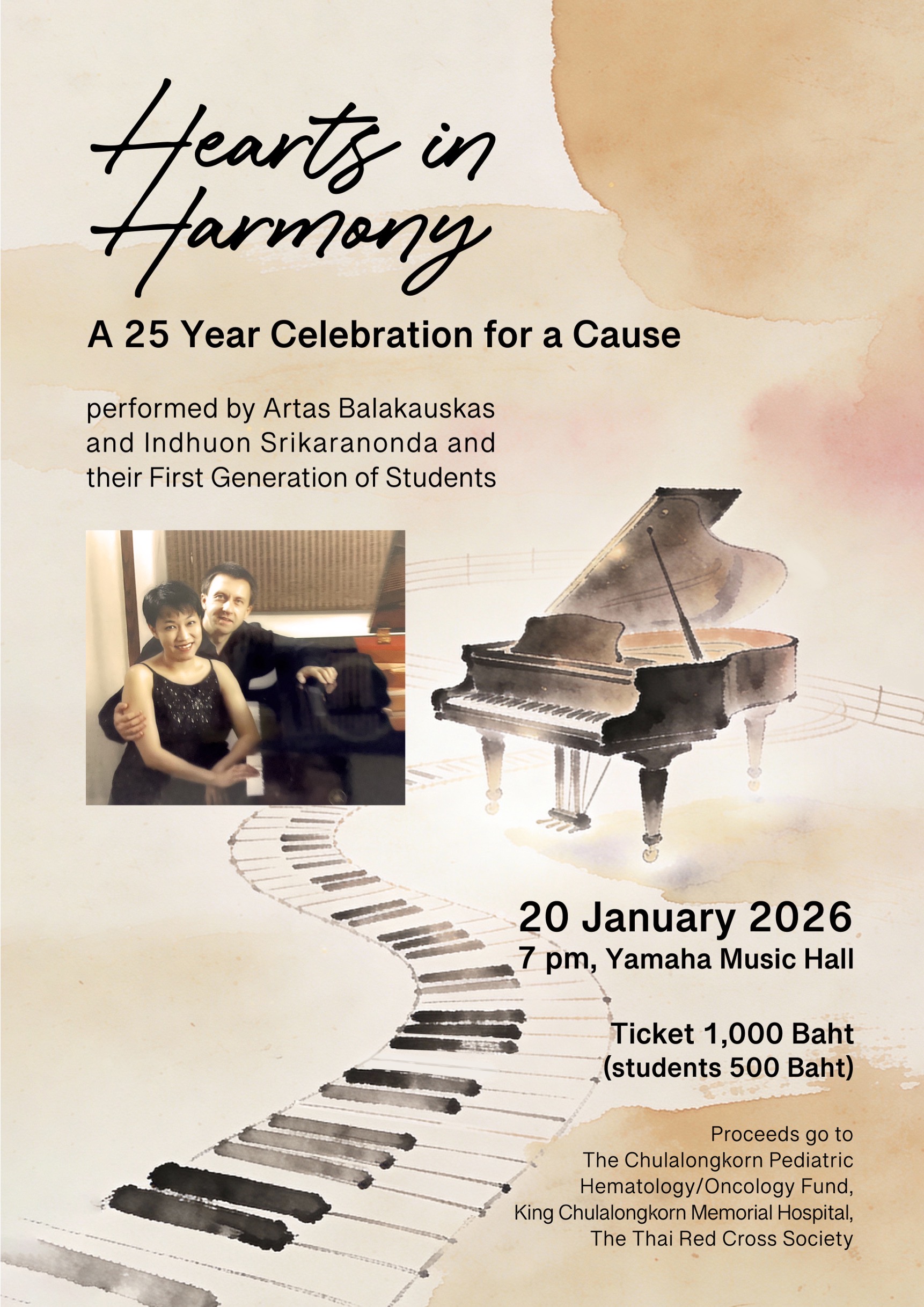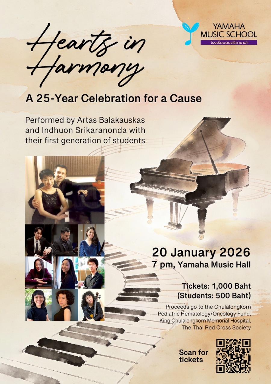 กรุงเทพฯ — วันที่ 20 มกราคม 2569 ขอเชิญร่วมสัมผัสค่ำคืนแห่งดนตรีคลาสสิกในคอนเสิร์ต Hearts in Harmony: A 25 Years Celebration for a Cause ณ Yamaha Music Hall คอนเสิร์ตเปียโนพิเศษเพื่อเฉลิมฉลองวาระครบรอบ 25 ปีของการอุทิศตนในเส้นทางการสอนและการสร้างสรรค์ทางดนตรีของอาจารย์ Artas Balakauskas และ อาจารย์อินทุอร ศรีกรานนท์ ร่วมกับ ลูกศิษย์รุ่นแรก (First Generation of Students) ซึ่งสะท้อนถึงสายสัมพันธ์ระหว่างครูและศิษย์ที่ดำเนินต่อเนื่องยาวนานผ่านเสียงดนตรี