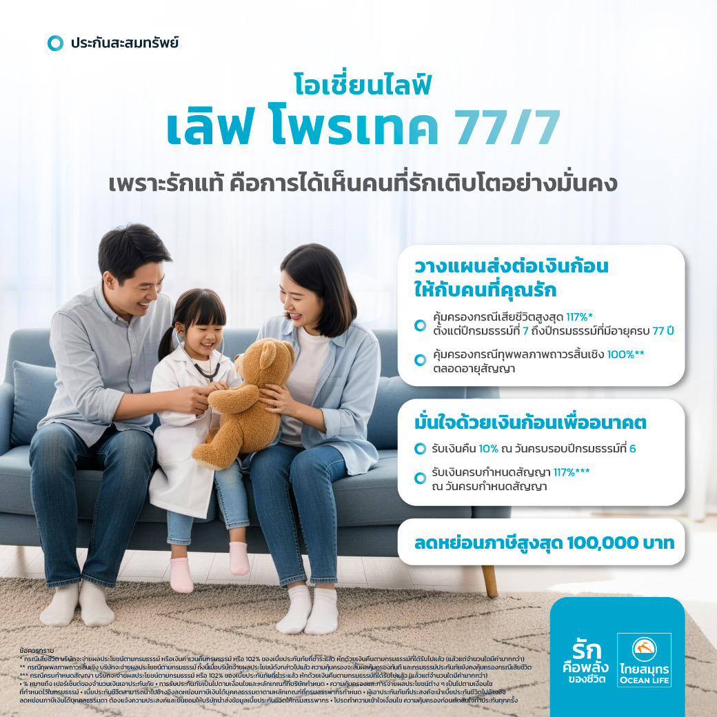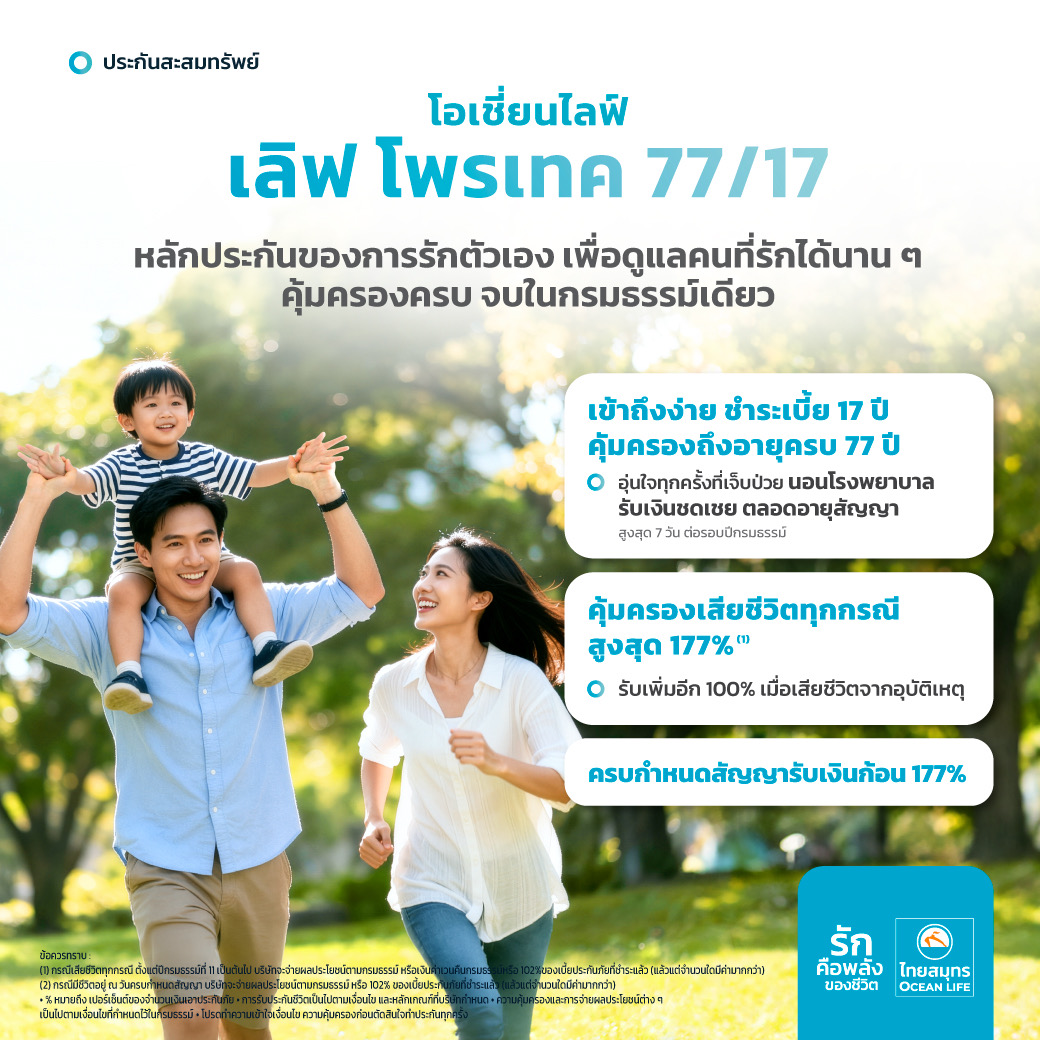 OCEAN LIFE ไทยสมุทร ฉลองครบรอบ 77 ปี เปิดตัว 2 สินค้าใหม่ “โอเชี่ยนไลฟ์ เลิฟ โพรเทค 77/7” ชูจุดเด่น จ่ายเบี้ยสั้น 7 ปี คุ้มครองชีวิตถึง 77 ปี และ “โอเชี่ยนไลฟ์ เลิฟ โพรเทค 77/17” คุ้มครองชีวิตถึง 77 ปี เบี้ยประกันเข้าถึงง่าย คุ้มครองครบ จบในกรมธรรม์เดียว