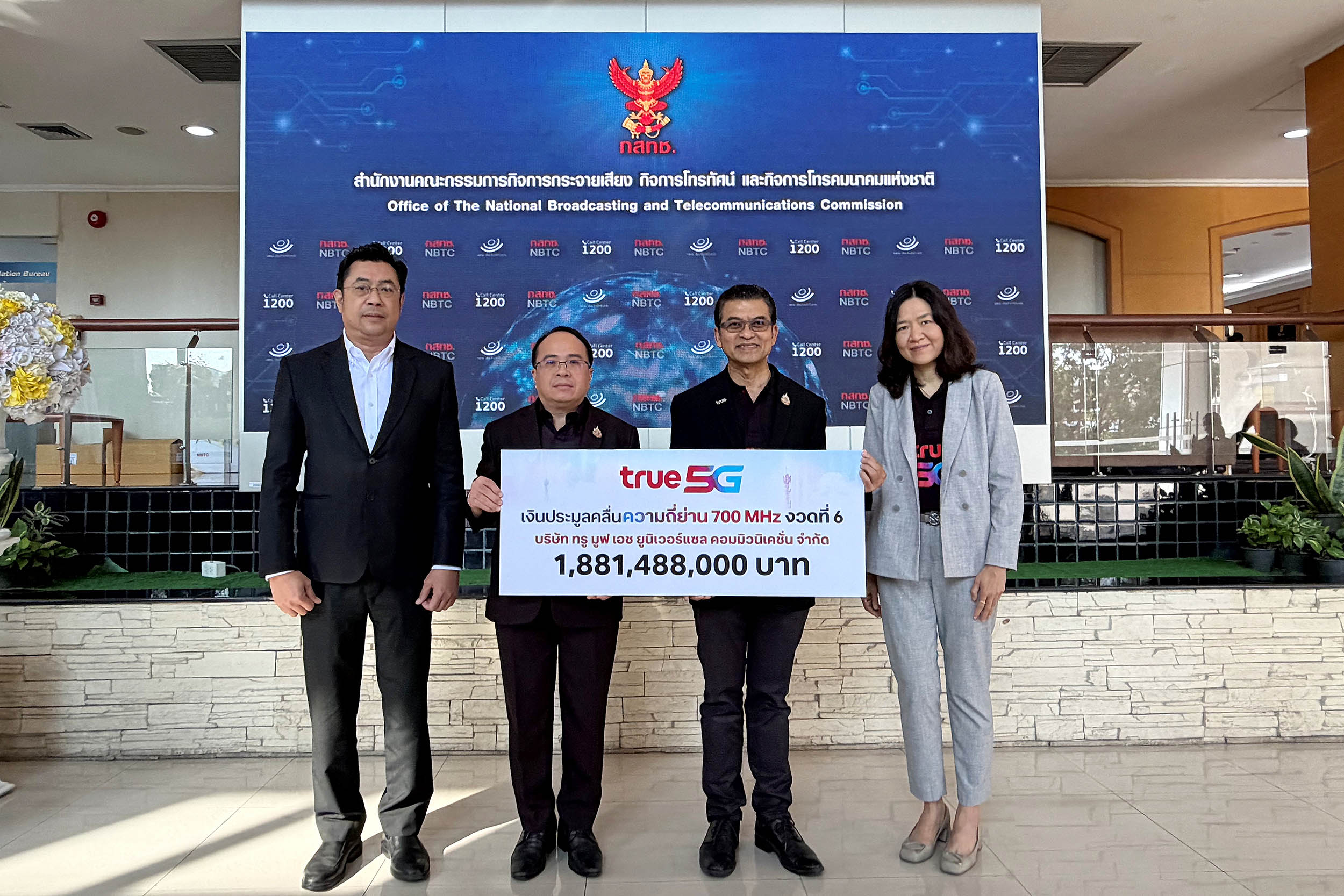 นายนฤพนธ์ รัตนสมาหาร (ที่ 3 จากซ้าย) หัวหน้าสายงานรัฐกิจสัมพันธ์และกำกับดูแล และ นางสาววีณา จ่างเจริญ (ขวาสุด) ผู้เชี่ยวชาญสายงานกลยุทธ์กฎระเบียบการกำกับดูแลกิจการบริษัท ทรู คอร์ปอเรชั่น จำกัด (มหาชน) เป็นผู้แทนส่งมอบเงินและหนังสือค้ำประกันต่อสำนักงาน กสทช. โดยมีนายสุทธิศักดิ์ ตันตะโยธิน (ที่ 2 จากซ้าย) รองเลขาธิการ กสทช. สายงานกิจการโทรคมนาคม และ นายภูมิภัส พลการ (ซ้ายสุด) ผู้อำนวยการสำนักสื่อสารองค์กร สำนักงาน กสทช. เป็นผู้รับมอบอย่างเป็นทางการ