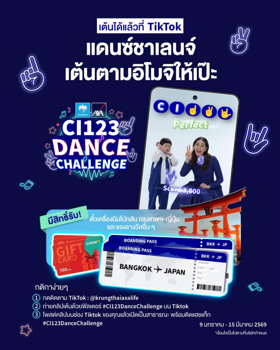 บมจ.กรุงไทย-แอกซ่า ประกันชีวิต ขอเชิญชวนทุกท่านร่วมแดนซ์ชาเลนจ์ กับน้องเกล และคุณชมพู่ อารยา ในกิจกรรม “CI 123 Dance Challenge” บนแพลตฟอร์ม TikTok โดยชวนมาร่วมเต้นให้สนุก พร้อมสุขภาพดี ผ่านการเต้นตามอีโมจิด้วยฟิลเตอร์เฉพาะของแคมเปญ ซึ่งฟิลเตอร์ดังกล่าวจะมีคะแนนเมื่อท่านเต้นตรงจังหวะและถูกท่าทาง โดยคลิปเต้นที่ได้คะแนนสูงสุดและถูกใจกรรมการมากที่สุด 2 อันดับแรก และคลิปเต้นที่มียอด Like สูงสุด 2 อันดับแรก จะได้รับรางวัลใหญ่ ตั๋วเครื่องบินไป-กลับ ประเทศญี่ปุ่น รวมทั้งหมด 4 รางวัล รางวัลละ 2 ที่นั่ง (มูลค่ารวม 100,000 บาท) และ คลิปเต้นที่โดนใจกรรมการจะได้รับบัตรกำนัลจาก Lotus’s มูลค่า 100 บาท จำนวน 50 รางวัล โดยการเข้าร่วมกิจกรรมไม่จำกัดสิทธิ์ ยิ่งส่งมาก ยิ่งมีสิทธิ์มาก