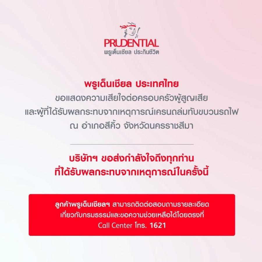 พรูเด็นเชียล ประเทศไทย ขอแสดงความเสียใจต่อครอบครัวผู้สูญเสีย และผู้ที่ได้รับผลกระทบจากเหตุการณ์เครนถล่มทับขบวนรถไฟ ณ อำเภอสีคิ้ว จังหวัดนครราชสีมา