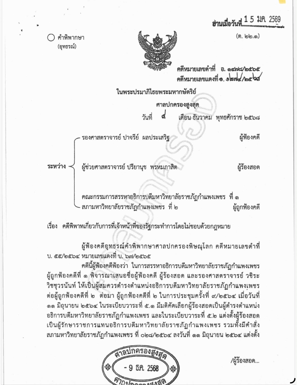 ผลคำพิพากษาศาลปกครองสูงสุด: คดีฟ้องว่าการสรรหาและคัดเลือกอธิการบดีมหาวิทยาลัยราชภัฏกำแพงเพชรไม่ชอบด้วยกฎหมาย