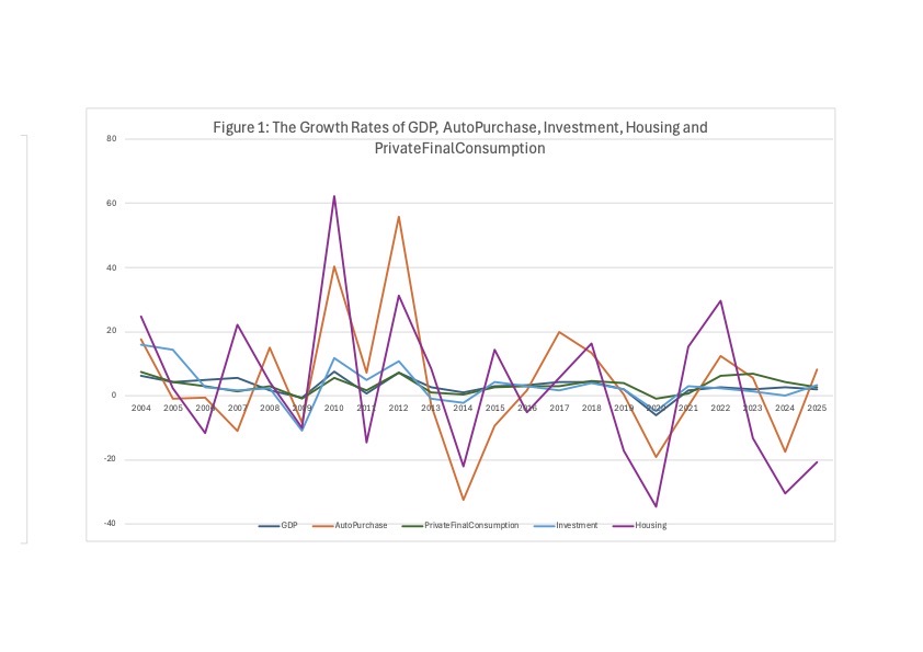 ภาวะเช่นนี้ มีส่วนสัมพันธ์กับตัวแปรเศรษฐกิจอื่น ๆ ด้วยดังแสดงใน Figure 1 การซื้อที่อยู่อาศัยกับรถยนต์มีความสัมพันธ์กันชัดเจนและมีขนาดความผันผวนสูงเหมือนกัน ตัวแปร 2 ตัวข้างต้นยังมีความสัมพันธ์กับการลงทุน ซึ่งจะส่งผลกระทบต่อไปถึงอัตราการขายตัวทางเศรษฐกิจ แต่ว่าความผันผวนของจีดีพีกับการลงทุนจะน้อยกว่าตัวแปรทั้งสองข้างต้นเป็นอย่างมาก พฤติกรรมเช่นนี้อาจอนุมานได้ว่า การซื้อที่อยู่อาศัยกับรถยนต์ขึ้นอยู่กับภาวะเศรษฐกิจและรายได้เป็นอย่างมากและได้รับผลกระทบในขนาดที่มากในทางตรงกันข้าม การเปลี่ยนแปลงของรายได้ในทางลบก็จะทำให้ผู้บริโภคหยุดการซื้อที่อยู่อาศัย/รถยนต์ในทันทีเช่นเดียวกันและมีขนาดที่รุนแรง ถ้าจะกล่าวเป็นภาษาชาวบ้านก็คือ ที่อยู่อาศัย/รถยนต์ เป็นของไม่จำเป็นถ้าจะตัดก็ตัดได้ทันที ในขณะเดียวกันรายได้ที่ดีขึ้นก็จะกระตุ้นให้ผู้บริโภคซื้อสินค้าสองอย่างนี้ทันที ในทางเศรษฐศาสตร์ อาจกล่าวได้ว่าสำหรับคนไทยแล้ว permanent income เป็น function ของรายได้ระยะสั้นมาก ๆ จึงเกิดพฤติกรรมดังที่แสดงใน Figure 1