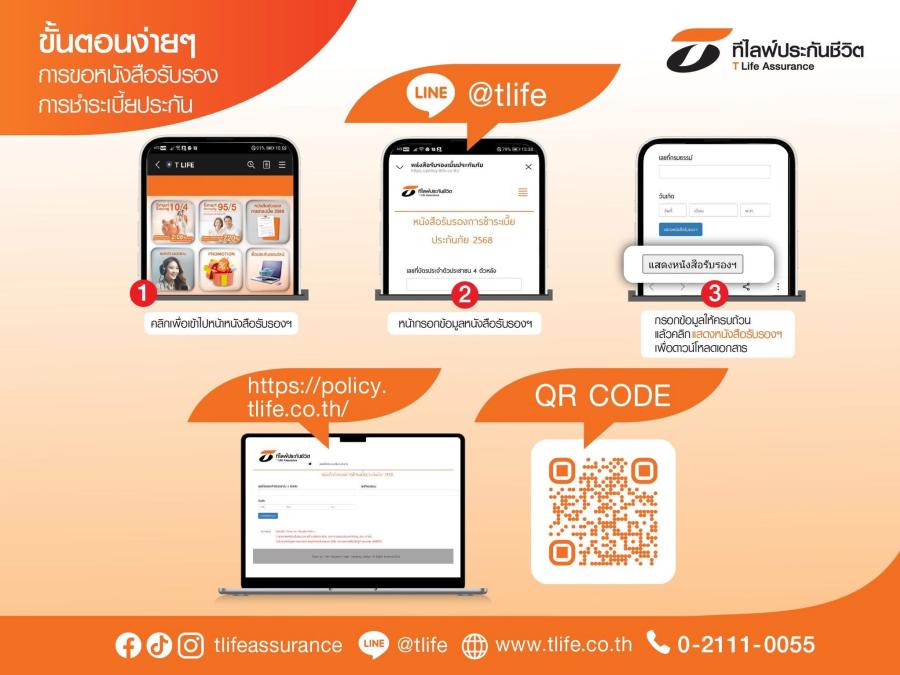 การให้บริการดังกล่าวช่วยให้ลูกค้าสามารถเข้าถึงเอกสารสำคัญได้อย่างรวดเร็ว ทุกที่ ทุกเวลา ตลอด 24 ชั่วโมง เพียงเข้า Line Official Account @tlife คลิกเมนู “หนังสือรับรองการชำระเบี้ย 2568” หรือเข้าเว็บไซต์ ที ไลฟ์ ประกันชีวิต www.tlife.co.th คลิกเมนู “หนังสือรับรองการชำระเบี้ย” หรือคลิก Link : https://policy.tlife.co.th จากนั้นทำตามขั้นตอนที่กำหนด โดยกรอกรายละเอียดให้ครบถ้วน ก็สามารถดาวน์โหลดหนังสือรับรองการชำระเบี้ยประกันภัยเพื่อนำไปใช้เป็นหลักฐานในการยื่นภาษีได้ทันที