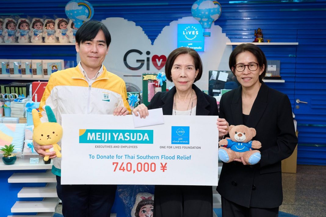 คณะผู้บริหารและพนักงาน บริษัท เมจิ ยาสุดะ ไลฟ์อินชัวรันส์ ร่วมสมทบทุนช่วยเหลือ ผู้ประสบอุทกภัยภาคใต้ ผ่าน มูลนิธิหนึ่งคนให้ หลายคนรับ จำนวน 740000 เยน (ประมาณ 146000 บาท)