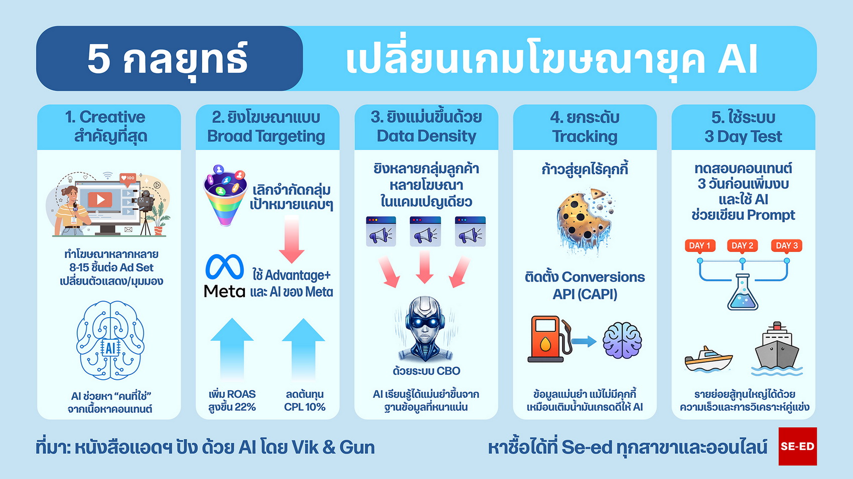 จากการรวบรวมประสบการณ์ตรงของคุณวิค - อัครวัฒน์ และคุณกัน - ชวพล ทั้งสองได้ถ่ายทอดลายแทงทางรอดผ่านหนังสือคู่มือการตลาด”แอดฯ ปังด้วย AI เปลี่ยนงบหลักร้อยเป็นเงินล้าน” โดยสรุป 5 กลยุทธ์ที่ต้องปรับใช้ทันที ดังนี้