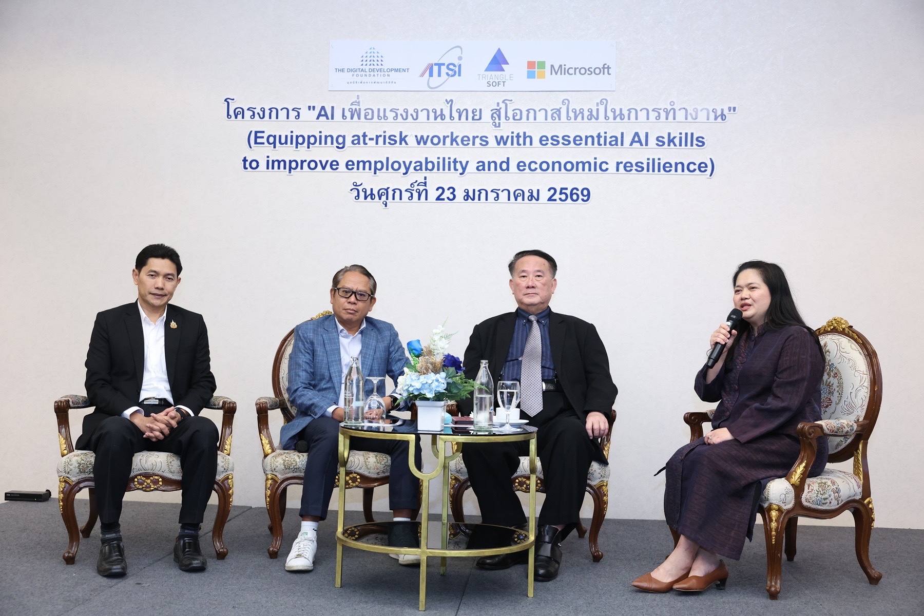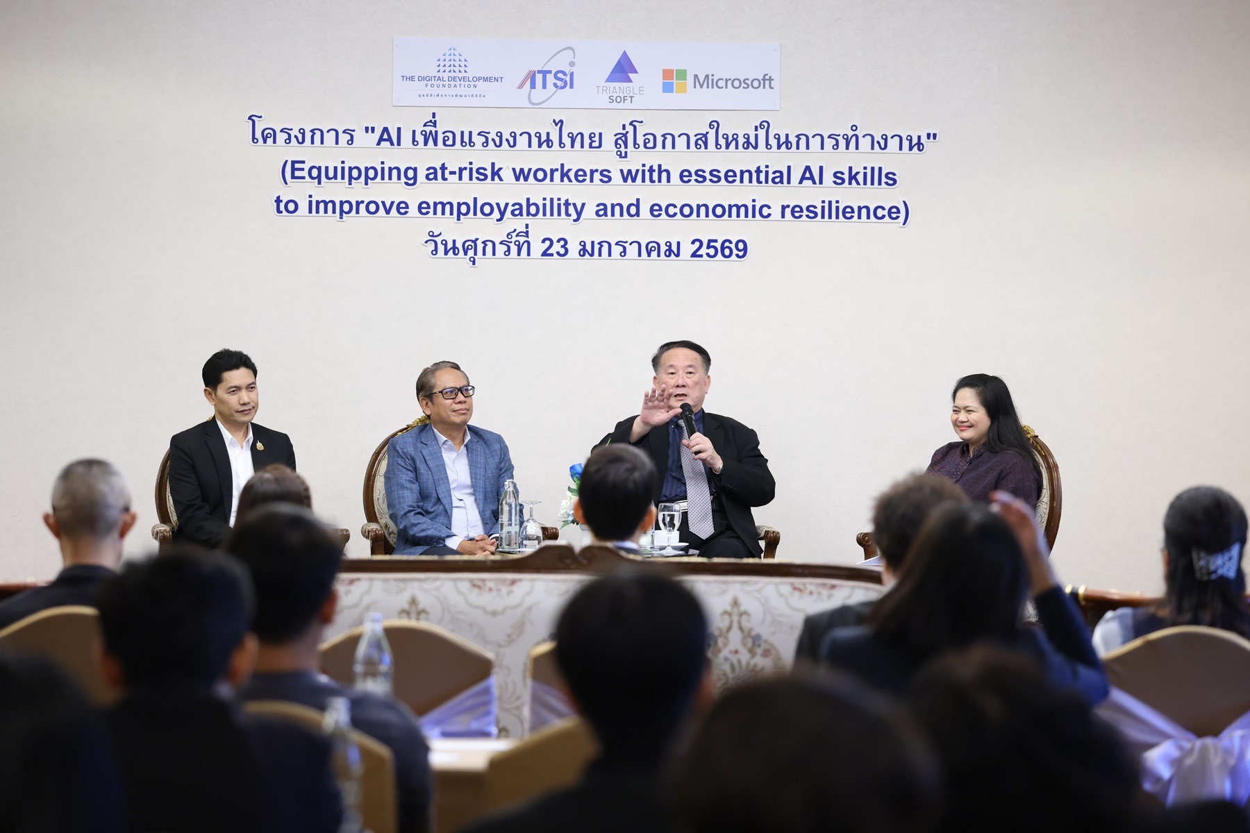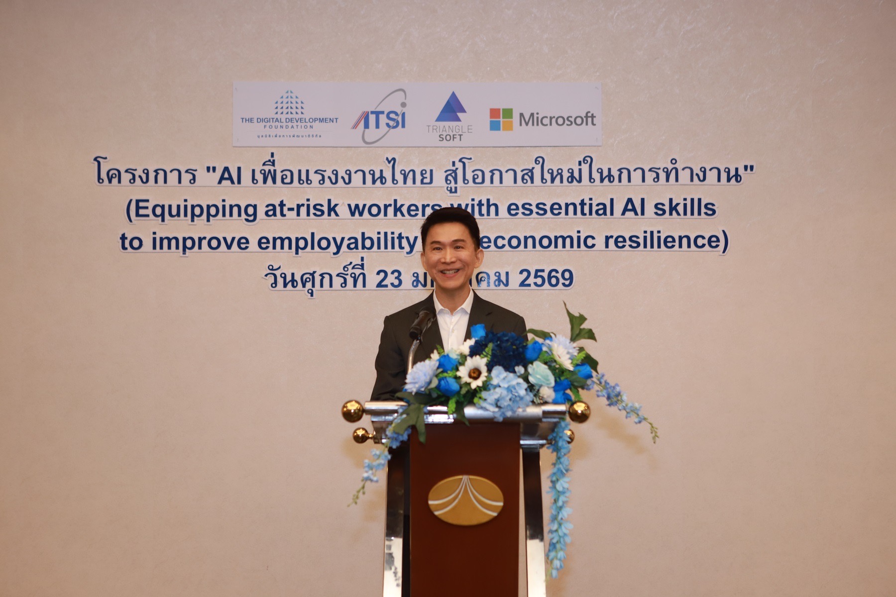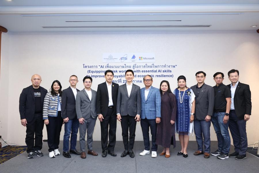 กรุงเทพฯ – มูลนิธิเพื่อการพัฒนาดิจิทัล (Digital Development Foundation: DDF) สมาคมอุตสาหกรรมซอฟต์แวร์ไทย (ATSI) และบริษัท ไทรแองเกิ้ลซอฟท์ จำกัด (TGS) ร่วมกับ บริษัท ไมโครซอฟท์ (ประเทศไทย) จำกัด และเครือข่ายพันธมิตรภาครัฐและเอกชน เปิดตัวโครงการ AI เพื่อแรงงานไทย สู่โอกาสใหม่ในการทำงาน อย่างเป็นทางการ ภายใต้คอนเซ็ปต์ “Equipping at-risk workers with essential AI skills to improve employability and economic resilience” เพื่อเสริมสร้างศักยภาพแรงงานไทยด้วยทักษะด้านปัญญาประดิษฐ์ (AI) รองรับการเปลี่ยนแปลงของตลาดแรงงานในยุคดิจิทัล