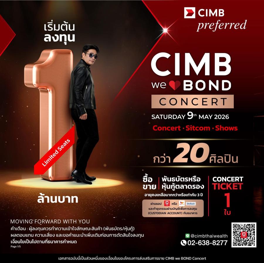 CIMB THAI จัดคอนเสิร์ตใหญ่ “CIMBweBOND Concert” รวม 20 ศิลปินระดับตำนาน & Gen Z 9 พ.ค.นี้ ที่ One Bangkok Forum เริ่มต้นลงทุนหุ้นกู้ 1 ล้านบาท เพื่อรับบัตรคอนเสิร์ต*