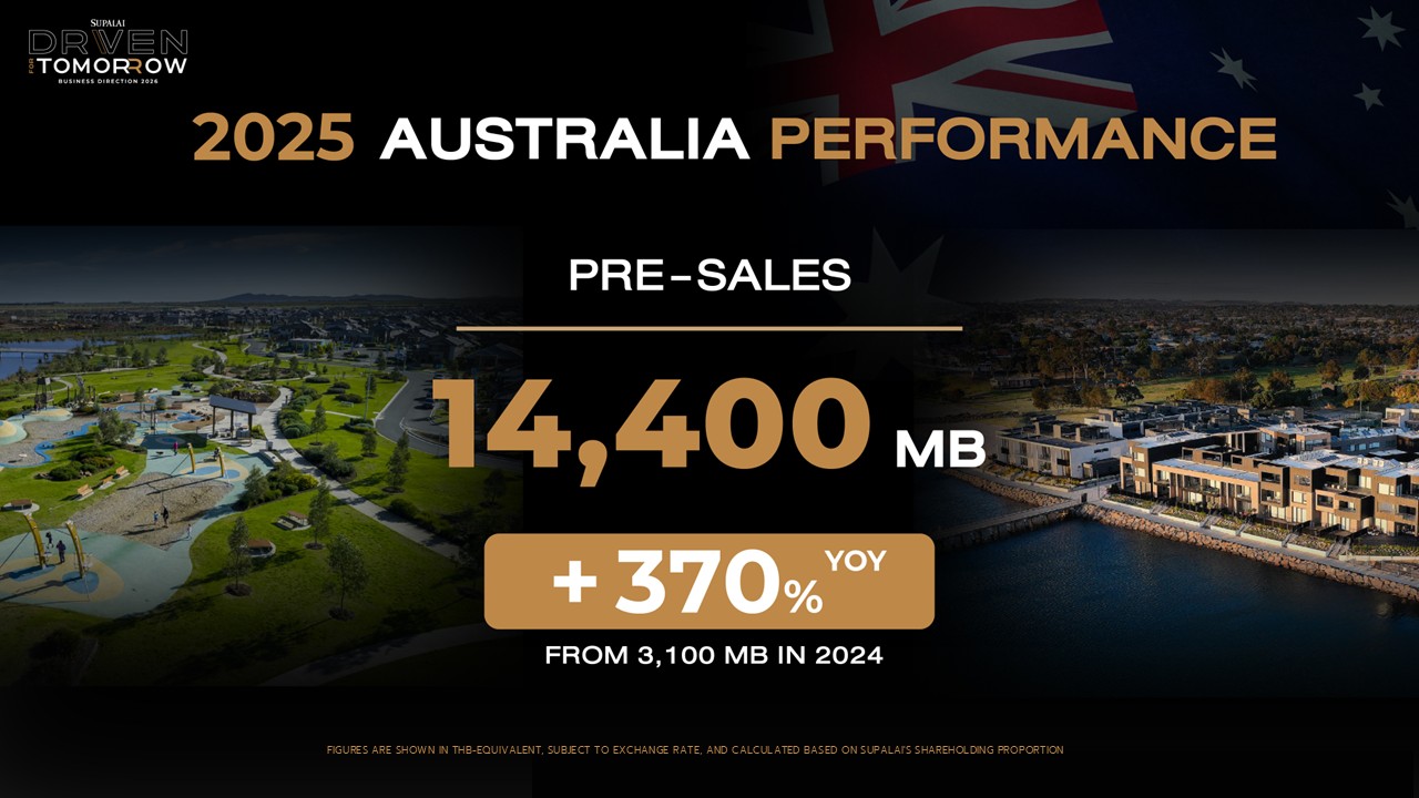 ขณะเดียวกันบริษัทฯ ต่อยอดกรอบคิดเดียวกันสู่พาร์ท Global Driven โดยชูออสเตรเลียเป็นตลาดต่างประเทศที่เห็นศักยภาพชัดเจนจากตัวเลขผลงาน ปี 2568 ที่เติบโตกว่า 370% และปี 2569 บริษัทฯ ตั้งเป้ายอดขายที่ 15,000 ล้านบาท* โดยเน้นบริหารพอร์ตให้ “สมดุล” และเลือกโครงการที่ตอบโจทย์ดีมานด์จริง เพื่อให้รายได้ต่างประเทศเป็นฐานที่มีคุณภาพและช่วยเสริมเสถียรภาพบริษัทฯ ในระยะยาว ในเชิงพอร์ตการลงทุน ปัจจุบันศุภาลัยกระจายการลงทุนในออสเตรเลียหลายรัฐ และในปี 2569 เตรียมเปิดใหม่ 1 โครงการในเมืองเมลเบิร์น ทำให้พอร์ตโครงการรวมอยู่ที่ 25 โครงการ ครอบคลุม 4 รัฐ 6 เมือง รวมมูลค่า 176,500 ล้านบาท* (ตามสัดส่วนการถือหุ้นของศุภาลัย) ซึ่งสะท้อนความพร้อมในการขยายการลงทุนอย่างเหมาะสมตามสภาพตลาดในแต่ละพื้นที่ เมื่อพูดถึงความยั่งยืน ศุภาลัยมองว่าการเติบโตอย่างต่อเนื่องต้องอาศัยระบบการทำงานที่สามารถติดตาม วัดผล และปรับตัวได้จริง เพื่อรองรับสถานการณ์ทางธุรกิจที่เปลี่ยนแปลงอย่างรวดเร็ว ในปี 2569 บริษัทฯ จึงเดินหน้าพัฒนาการทำงานในรูปแบบ Data Drivenผ่านการเชื่อมโยงข้อมูลเข้าสู่ “The Data Frontier” หรือศูนย์กลางข้อมูลขององค์กร (Central Brain) พร้อมวางกรอบ Data Governance ที่ชัดเจน เพื่อให้ข้อมูลจากทุกหน่วยงานสามารถเชื่อมโยงและใช้งานร่วมกันได้อย่างมีประสิทธิภาพ ช่วยลดงานซ้ำซ้อน เพิ่มความคล่องตัว และสนับสนุนการตัดสินใจเชิงกลยุทธ์ ขณะเดียวกันศุภาลัยยังนำข้อมูลมาประยุกต์ใช้เพื่อยกระดับประสบการณ์ลูกค้าผ่านแอปพลิเคชัน “SABAI” โดยเตรียมเปิดตัวฟีเจอร์ใหม่กว่า 35 ฟีเจอร์ สะท้อนความมุ่งมั่นของศุภาลัยในการพัฒนานวัตกรรมและบริการดิจิทัลอย่างต่อเนื่อง เพื่อสร้างประสบการณ์ที่ดีที่สุดให้กับลูกค้าในทุกช่วงเวลา