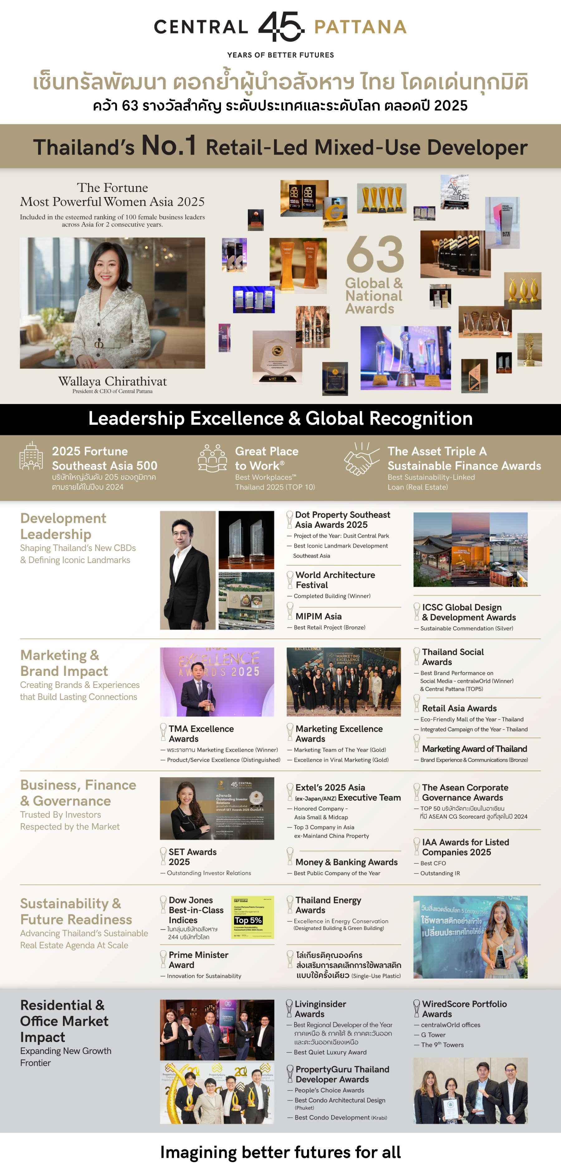 บริษัท เซ็นทรัลพัฒนา จำกัด (มหาชน) ผู้นำเบอร์หนึ่งอสังหาริมทรัพย์ไทยเพื่อความยั่งยืน ภายใต้วิสัยทัศน์ Imagining better futures for all เชื่อมโยงทุกธุรกิจทั้ง Retail-Residence-Hotel-Office ประกาศความสำเร็จตอกย้ำความเป็นผู้นำด้วยผลงานคว้า 63 รางวัลบนเวทีสำคัญระดับประเทศและระดับโลก ตลอดปี 2568 ครอบคลุมทุกด้านทั้ง Business and Financial Performance, Development and Design, Marketing, People Development และ Sustainability ด้วยประสบการณ์และความเชี่ยวชาญในการเป็นนักพัฒนาที่สร้างสรรค์พื้นที่และโครงการต่างๆ เพื่อยกระดับคุณภาพชีวิตของผู้คน ชุมชน เมืองและเป็นหนึ่งในกำลังสำคัญที่ขับเคลื่อนเศรษฐกิจประเทศไทยมาอย่างต่อเนื่อง