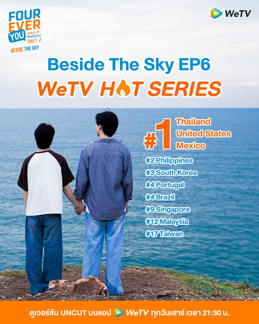 อีกหนึ่งผลงานกระแสแรง ฮอตตั้งแต่ต้นปี สำหรับซีรีส์วายโรแมนติก–คอมเมดี้ “Fourever You Part 2 : Beside The Sky ต้นฟ้าไต้ฝุ่น” ที่ยิ่งออน ยิ่งเสิร์ฟความฟินแฟน ๆ ไปทั่วไทม์ไลน์ เพราะด้วยเรื่องราวน่าติดตาม ดูเพลิน จนทำให้ซีรีส์ขึ้นแท่นอันดับ 1 WeTV HOT TV Series บน WeTV ในหลายประเทศ ทั้ง Thailand, United States และ Mexico ตอกย้ำกระแสฮิตแบบไวรัลข้ามประเทศ ขณะเดียวกันแฮชแท็ก #FoureverYou2EP6 ก็พุ่งแรงติดเทรนด์ X อันดับ 1 Thailand และอันดับ 2 Philippines กลายเป็นโมเมนต์ที่แฟน ๆ แชร์กันอย่างต่อเนื่อง