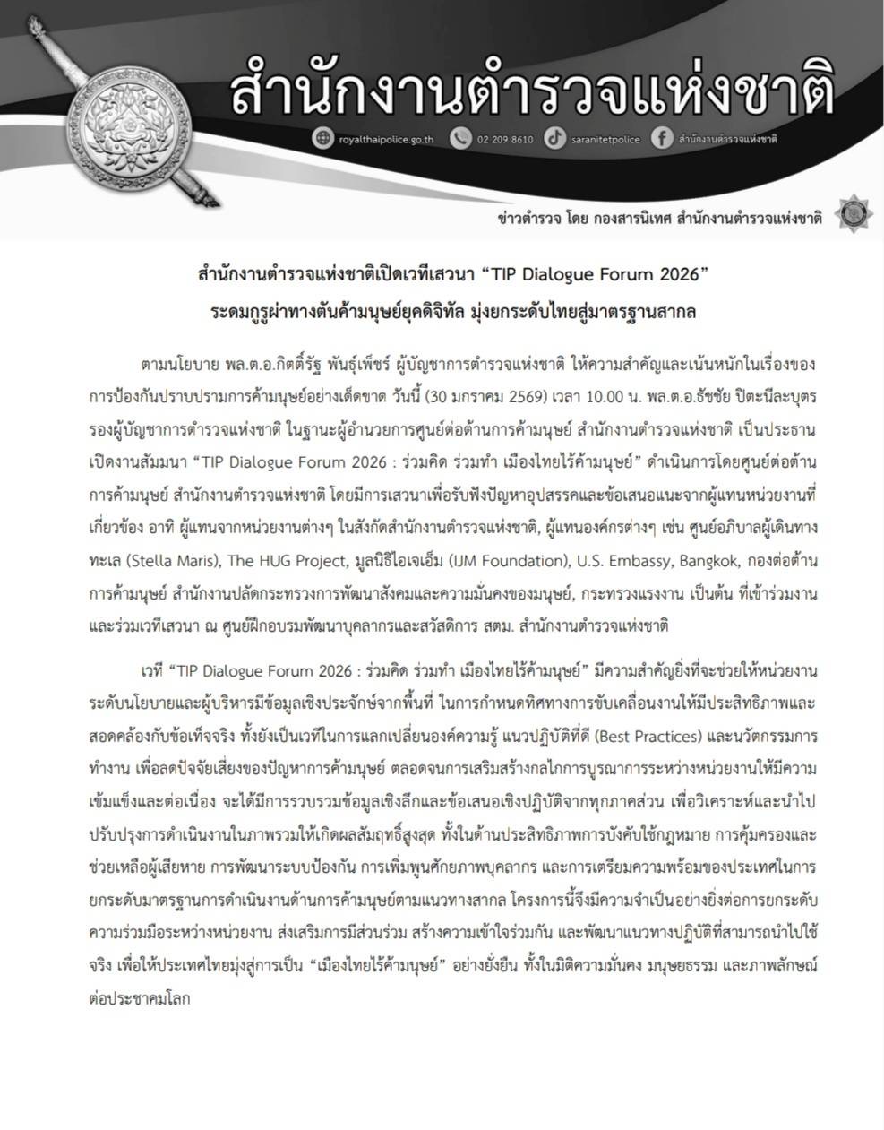 ตามนโยบาย พล.ต.อ.กิตติ์รัฐ พันธุ์เพ็ชร์ ผู้บัญชาการตำรวจแห่งชาติ ให้ความสำคัญและเน้นหนักในเรื่องของการป้องกันปราบปรามการค้ามนุษย์อย่างเด็ดขาด วันนี้ (30 มกราคม 2569) เวลา 10.00 น. พล.ต.อ.ธัชชัย ปิตะนีละบุตร รองผู้บัญชาการตำรวจแห่งชาติ ในฐานะผู้อำนวยการศูนย์ต่อต้านการค้ามนุษย์ สำนักงานตำรวจแห่งชาติ เป็นประธานเปิดงานสัมมนา “TIP Dialogue Forum 2026 : ร่วมคิด ร่วมทำ เมืองไทยไร้ค้ามนุษย์” ดำเนินการโดยศูนย์ต่อต้านการค้ามนุษย์ สำนักงานตำรวจแห่งชาติ โดยมีการเสวนาเพื่อรับฟังปัญหาอุปสรรคและข้อเสนอแนะจากผู้แทนหน่วยงานที่เกี่ยวข้อง อาทิ ผู้แทนจากหน่วยงานต่างๆ ในสังกัดสำนักงานตำรวจแห่งชาติ, ผู้แทนองค์กรต่างๆ เช่น ศูนย์อภิบาลผู้เดินทางทะเล (Stella Maris), The HUG Project, มูลนิธิไอเจเอ็ม (IJM Foundation), U.S. Embassy, Bangkok, กองต่อต้านการค้ามนุษย์ สำนักงานปลัดกระทรวงการพัฒนาสังคมและความมั่นคงของมนุษย์, กระทรวงแรงงาน เป็นต้น ที่เข้าร่วมงาน และร่วมเวทีเสวนา ณ ศูนย์ฝึกอบรมพัฒนาบุคลากรและสวัสดิการ สตม. สำนักงานตำรวจแห่งชาติ