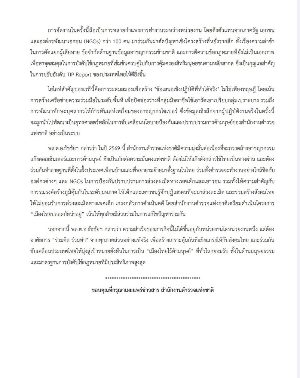 นอกจากนี้ พล.ต.อ.ธัชชัยฯ กล่าวว่า ความสำเร็จของภารกิจนี้ไม่ได้ขึ้นอยู่กับหน่วยงานใดหน่วยงานหนึ่ง แต่ต้องอาศัยการ “ร่วมคิด ร่วมทำ” จากทุกภาคส่วนอย่างแท้จริง เพื่อสร้างเกราะคุ้มกันที่แข็งแกร่งให้กับสังคมไทย และร่วมกันขับเคลื่อนประเทศไทยให้มุ่งสู่เป้าหมายยั่งยืนในการเป็น “เมืองไทยไร้ค้ามนุษย์” ที่ทั่วโลกยอมรับ ทั้งในด้านมนุษยธรรมและมาตรฐานการบังคับใช้กฎหมายที่มีประสิทธิภาพสูงสุด