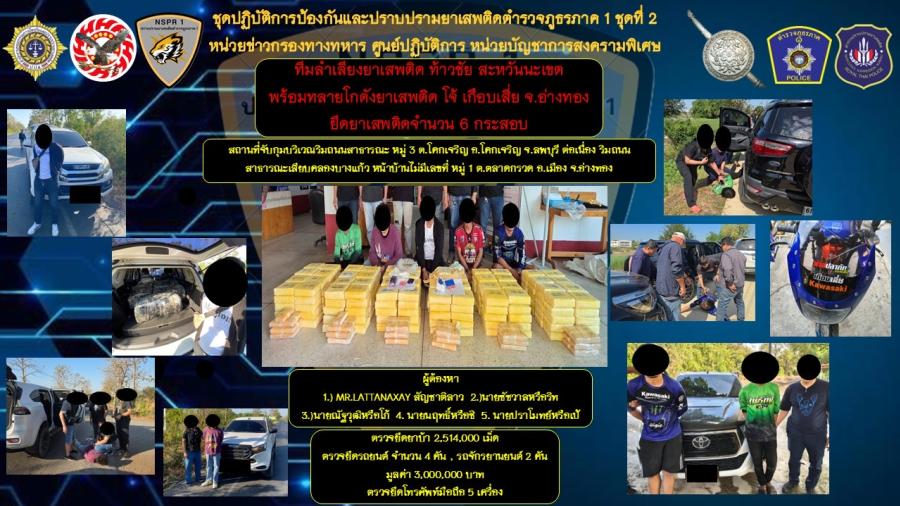 ได้ร่วมกันสืบสวนจับกุม ผู้ต้องหาที่ทำหน้าที่จัดเก็บและลำเลียงยาเสพติดกลุ่ม “ทีมลำเลียงยาเสพติด ท้าวชัย สะหวันนะเขต พร้อมทลายโกดังยาเสพติด โจ้ เกือบเสี่ย จ.อ่างทอง” จับกุมผู้ต้องหา 5 ราย คือ